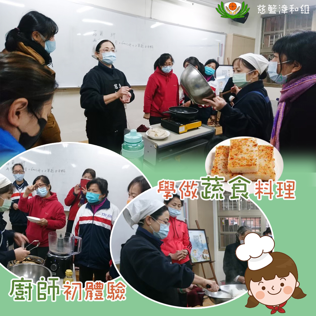 慈濟中和三和氣長許碧珠師姊做蘿蔔糕和黃金花師姊製作哇沙米三明治,吸引不少師姊隊輔參與,讓大家知道素食材料很簡單,好吃又不難。多吃蔬果會讓人覺得心情愉快,很多蔬果對心情都有神奇的治癒力,吃得多心情就會好。