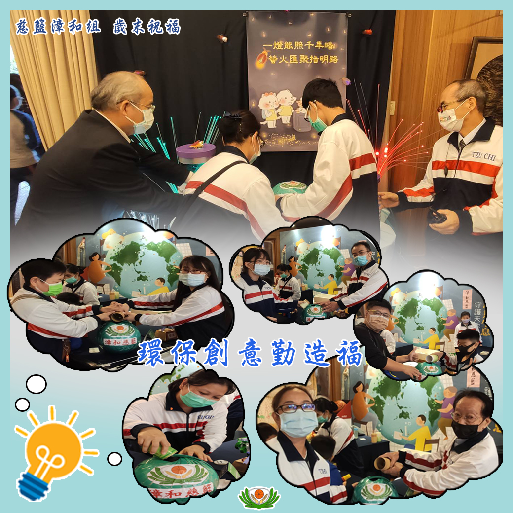 在歲末祝福前夕漳和慈籃突發其想,我們可以用環保概念創造出自己的特色。就在這次的濟濟愛心竹筒,想出迷你型的竹筒,用不同的方式,讓每一位家人把竹同帶回靜思堂。大家都非常的好奇,用打包袋如何製作成籃球,過程真是一波三折,歲末祝福前一天才大功告成,大家看到成品也很踴躍參與歲末祝福和竹筒回娘家,將點滴的愛心匯入疫苗之愛。