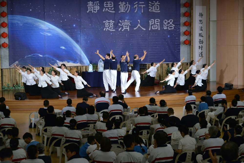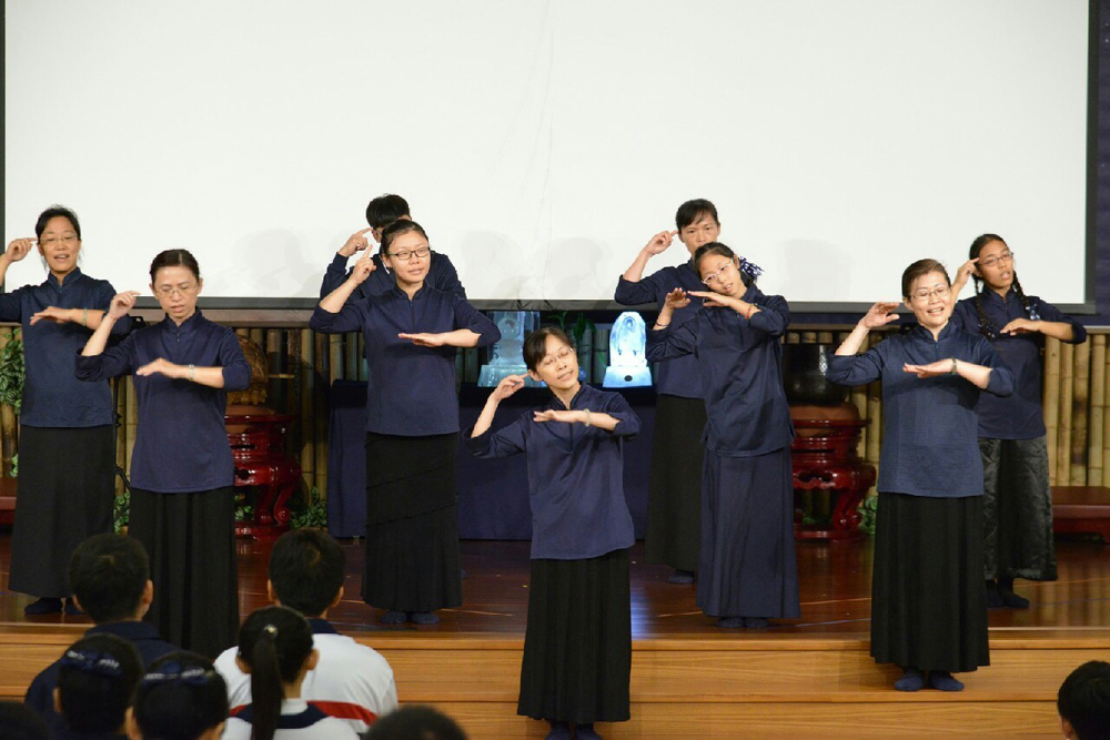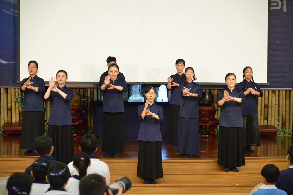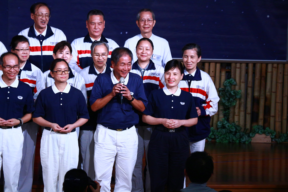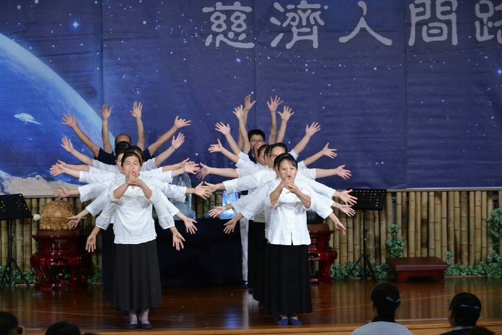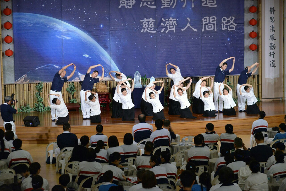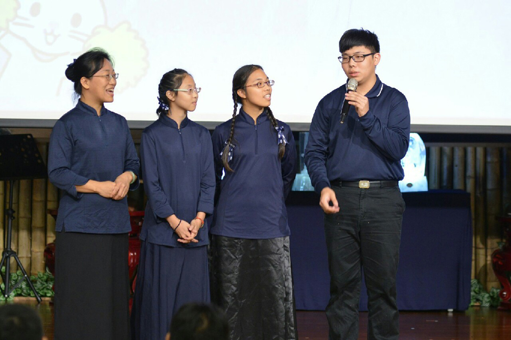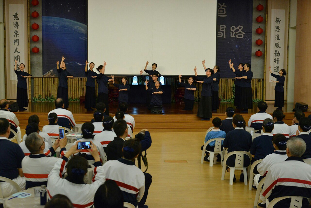 而串場的中和組/楊梅組/基隆組/板橋組四組的表演活動搭配志工分享,每一組至少有20位以上的大小菩薩上台團隊演繹呈現,證明了慈籃家族動靜皆宜,看到他們在台上演繹的表情如此生動,讓台下的觀眾們很攝心。而基隆組柯亮宇一家四人上台分享,因為孩子在學習上有些遲緩,而沒有耐心常以 " 嚴厲 " 教育孩子,但加入慈籃後了解需要用更多的愛心來陪伴孩子,現在每周慈籃活動是全家人最快樂的家庭活動了;楊梅組家長何美惠與女兒胡文馨共同演繹後分享,雖然家中遭受到變故/挫折,但楊梅家族成員每每在黑暗中點一把火,除了讓師姊能安身外還安心;另外一對板橋組家長楊淑芳與兒子女兒 (彭昱惟、彭昱寧、彭昱綺),因為在人文課程中,了解到善用自己的良能,做對的事,同時也催促媽媽趕緊授證,為 師公上人多承擔,他們會為媽媽打理好家裡大小事,讓媽媽能沒有後顧之憂而安心培訓。這些孩子加入慈籃後更加懂事,帶動家人一同投入,而這樣的改變讓所有志工團隊更加自我勉勵與付出來 " 知福,惜福,再造福 " 。