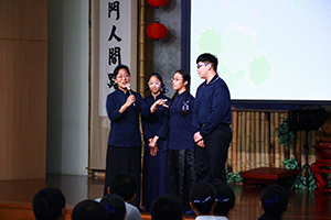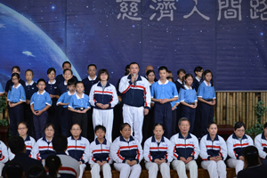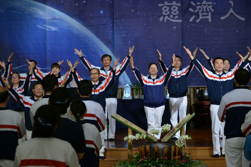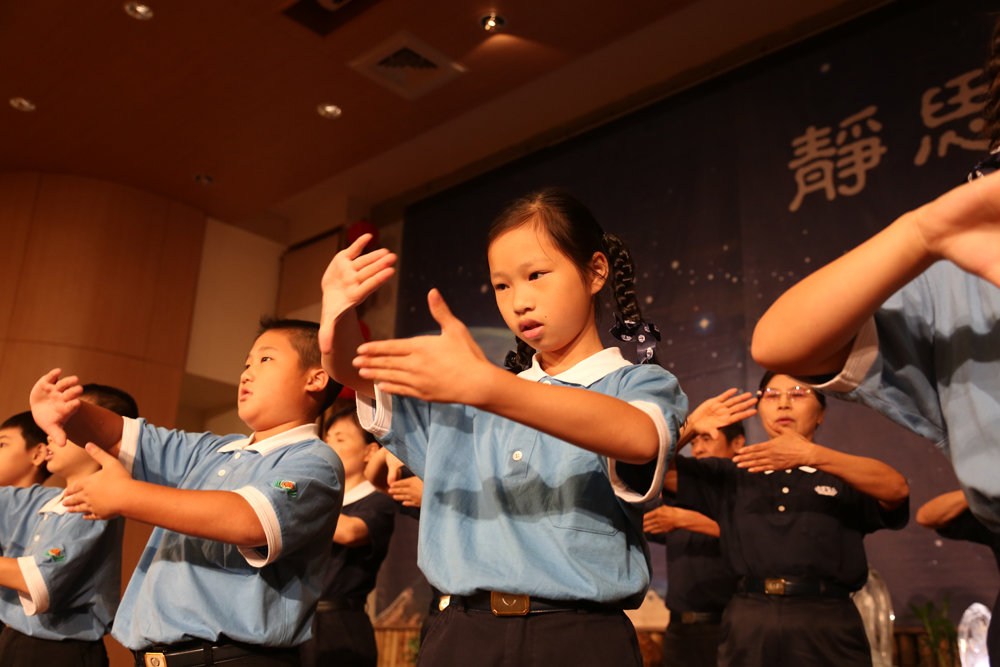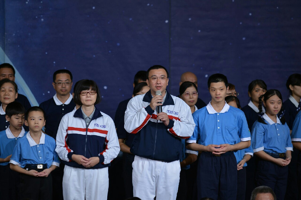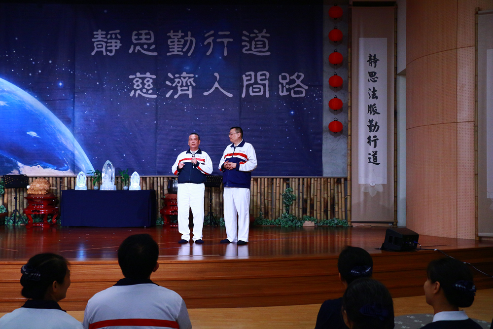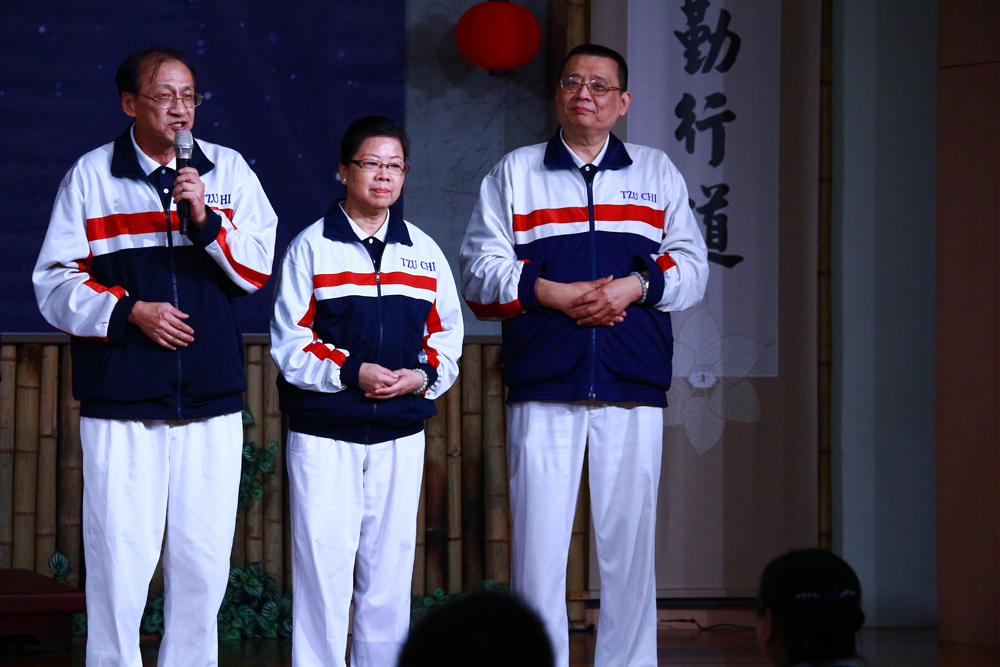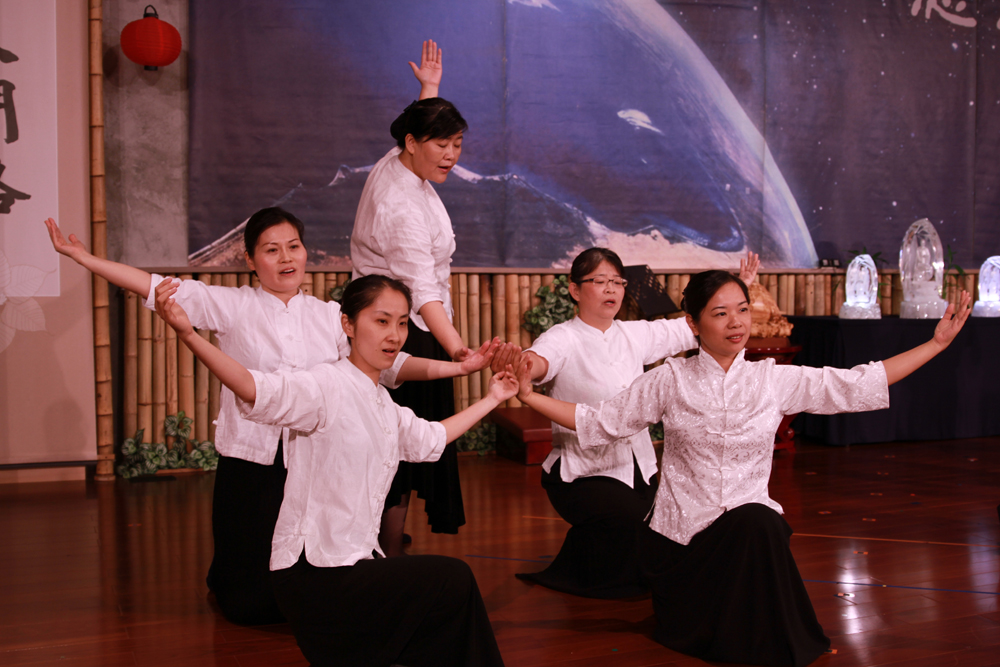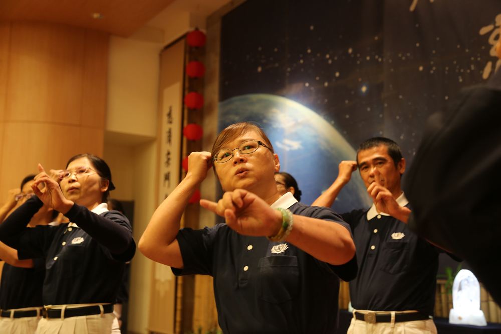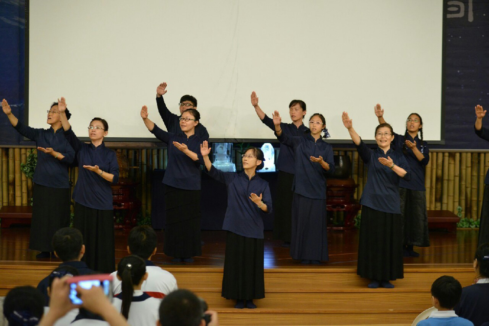 而串場的中和組/楊梅組/基隆組/板橋組四組的表演活動搭配志工分享,每一組至少有20位以上的大小菩薩上台團隊演繹呈現,證明了慈籃家族動靜皆宜,看到他們在台上演繹的表情如此生動,讓台下的觀眾們很攝心。而基隆組柯亮宇一家四人上台分享,因為孩子在學習上有些遲緩,而沒有耐心常以 " 嚴厲 " 教育孩子,但加入慈籃後了解需要用更多的愛心來陪伴孩子,現在每周慈籃活動是全家人最快樂的家庭活動了;楊梅組家長何美惠與女兒胡文馨共同演繹後分享,雖然家中遭受到變故/挫折,但楊梅家族成員每每在黑暗中點一把火,除了讓師姊能安身外還安心;另外一對板橋組家長楊淑芳與兒子女兒 (彭昱惟、彭昱寧、彭昱綺),因為在人文課程中,了解到善用自己的良能,做對的事,同時也催促媽媽趕緊授證,為 師公上人多承擔,他們會為媽媽打理好家裡大小事,讓媽媽能沒有後顧之憂而安心培訓。這些孩子加入慈籃後更加懂事,帶動家人一同投入,而這樣的改變讓所有志工團隊更加自我勉勵與付出來 " 知福,惜福,再造福 " 。