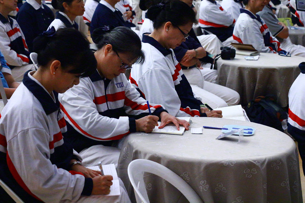 在一整天的精進日活動中,大愛劇場 " 一閃一閃亮晶晶 " 的本尊也是資深教師 曾裕真師姊透過 " 老師心 菩薩心 " ,用真情感人入人心,傳達正確的教育理念給台下的家長們,教導家長們如何深入靜思語淺出妙教學,讓正值家有青春期 (常帶有若干的叛逆) 的家長們更了解如何運用善巧方法來與孩子們互動。骨髓推廣總幹事 陳乃裕師兄則分享了許多感動的骨髓個案,串聯生命髓緣這堂課,課程中感動了許多家長,也提醒大家要重視自己的健康,並把握每一次骨髓驗血建檔活動的機會,最後慈籃家族木柵組 秀櫻師姊及基隆組聯絡人麗貞師姊分別分享自己及兒子捐髓的心路歷程,再再證明救人一命無損己身,期待招募更多有緣人,一起發一份善念幫助更多人。最後,海外歷任馬六甲及新加坡分會執行長的劉濟雨師兄的心路,則將自己這幾年在 證嚴上人身旁隨師,與幾十年來在慈濟路上的法喜與大家享,從幽默風趣的口吻中,鼓勵大家精進不懈怠,持續跟隨慈濟人的腳步,一同精進在菩薩道上。