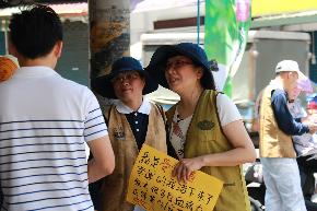 楊梅區公所旁的大成路上,艷陽高掛、熱氣蒸騰得像個大火爐,曬得人發昏;飲料店前大排長龍,人群中卻見穿著「藍天白雲」的慈濟志工,不畏高溫,把握機會不斷地向路人宣導, 希望他們可以參與造血幹細胞捐贈驗血、救人。