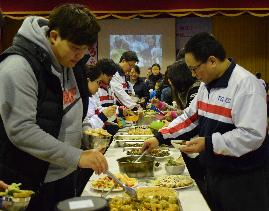 今天(2/8)是慈濟青少年籃球隊恆毅組,一年一度的家聚聯誼賽暨餐會。雖寒流來襲,卻襲不退孩子們期盼的熱情。八點未到,新北市新莊區恆毅中學球場已打掃得非常乾淨。志 工們盡速分工合作,場控、音控、場佈、接待、生活、賽程規劃……期望活動能順利進行。