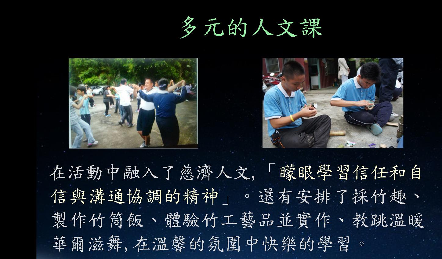 在活動中融入了慈濟人文,「矇眼學習信任和自信與溝通協調的精神」。還有安排了採竹趣、製作竹筒飯、體驗竹工藝品並實作、教跳溫暖華爾滋舞,在溫馨的氛圍中快樂的學習。