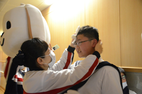 跟著大愛狗、感恩貓的腳步,我們到了五樓的兒科病房,帶著滿滿的關懷與笑容到病房裡膚慰,每個小朋友看到都好開心;有些小朋友手上都還插著點滴,有些躺在床上,每當他們看見大愛狗與感恩貓時,展現的那種笑容,好像讓他們忘記了病痛。飾演感恩貓的彭羿凱,今年就讀大學二年級,趁著寒假回到慈籃楊梅組服務,第一次參加音樂志工的羿凱,有滿滿的心得,羿凱說慈籃是我第二個家:「去年回到楊梅當任助教,感恩師姑的邀約來參加音樂志工,這次的任務是承擔感恩貓;一開始有先試穿過,沒有想像中的那麼累,但是,實際上其實是滿辛苦的。陪伴這些爺爺奶奶與小朋友的當下,看到他們的笑容其實是很開心的,身體上的累也都值得。」