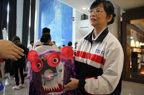 圖說:楊梅組的楊玉芬師姑分享:「在環保回收站時,看到電風扇的殼,想到剛好可以拿來當做舞獅的臉,而眼睛則是利用回收的塑膠碗及保麗龍球做成的,應映即將過節的氣氛,把它變成環保舞獅。」[攝影者:盧碧芳/姜郁雯]