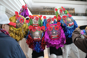節目到了尾聲,即將出場的是,在舊曆年之前帶動過年氣氛,慈籃志工們用心準備「環保舞獅」道具,呈現舞獅表演。楊梅組楊玉芬師姊分享如何發揮巧思製作道具:「在環保回收站時,看到電風扇的殼,想到剛好可以拿來當做舞獅的臉,而眼睛則是利用回收的塑膠碗及保麗龍球做成的,應映即將過節的氣氛,把它變成環保舞獅。」從環保站尋找可用的道具,化腐朽為神奇,將原本被別人視為垃圾,變成表演道具。