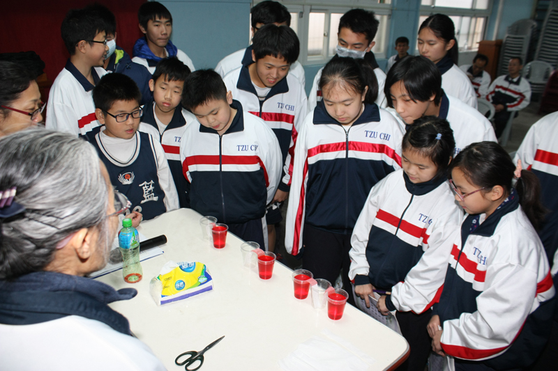 圖右:在楊梅慈籃人文課程中進行菩提種子教案-大愛,透過學員實作在水中加入紅墨水,因為水的移動讓整盆水都渲染紅,體驗到愛的傳遞可以幫助人。[攝影者:張志豪、盧碧芳]