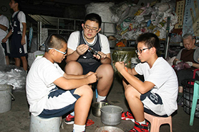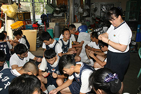 孩子從動態的籃球場移到靜態的環保站,依然可以如此的專注,正是慈籃對所有的孩子們一份期待 圖片中的蔣堃男和許秀琴是夫妻同修,對於楊梅環保站的護持及付出,是社區有目共睹的,更是護持慈籃家族11年來做環保的後盾。