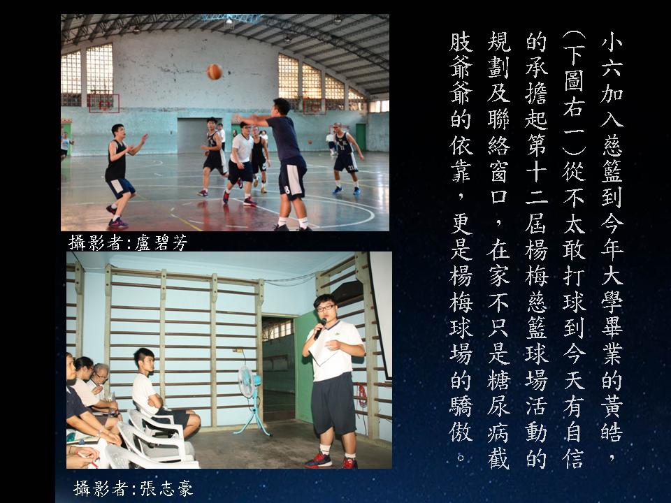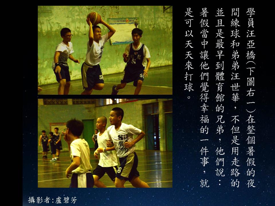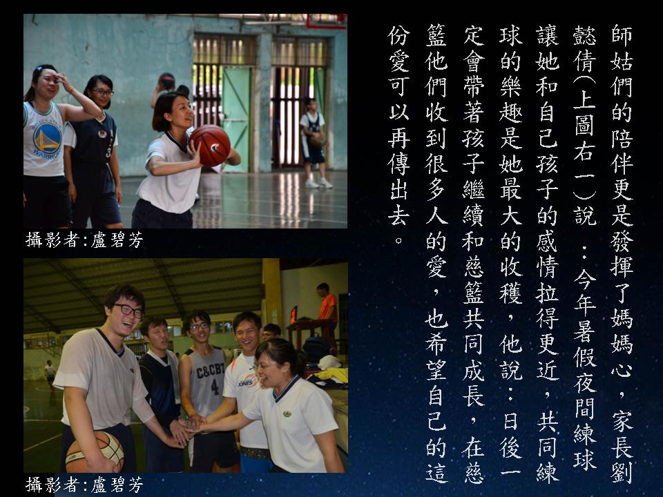 慈籃楊梅特有的暑假-夜間練球,自楊梅組成立至今已延續整整十一年,楊梅組的聯絡人雖然記不清楚當初夜間練球產生的確切因緣,但一定是和慈濟青少年籃球隊的暑期聯誼賽有密切的關係,或許是為了暑期聯誼賽的加強訓練,但十一年後的今天對所有楊梅家族而言,球技的訓練已不單是夜間練球存在的必要之一,以今年夜間練球時間足足的七個星期,要投入的陪伴人力及精神而言,相信這份的堅持是來自於它-夜間練球是凝聚楊梅家族之間一份情感的來源,給出外的孩子有一個不一樣的家,給這個家的師姑、師伯有了一份使命,因為如此,夜間練球已是楊梅慈籃一個不可或缺的存在。