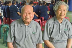 圖說 :一對高齡90歲老菩薩,夫妻倆攜手做環保已經十年以上,一星期來環保站做兩天環保;笑到合不攏嘴何木石表示,這裡師兄、師姊都很好,我們做完環保都會載我們回去,在這殊勝的日子,祝福大家法喜充滿,歡喜快樂。