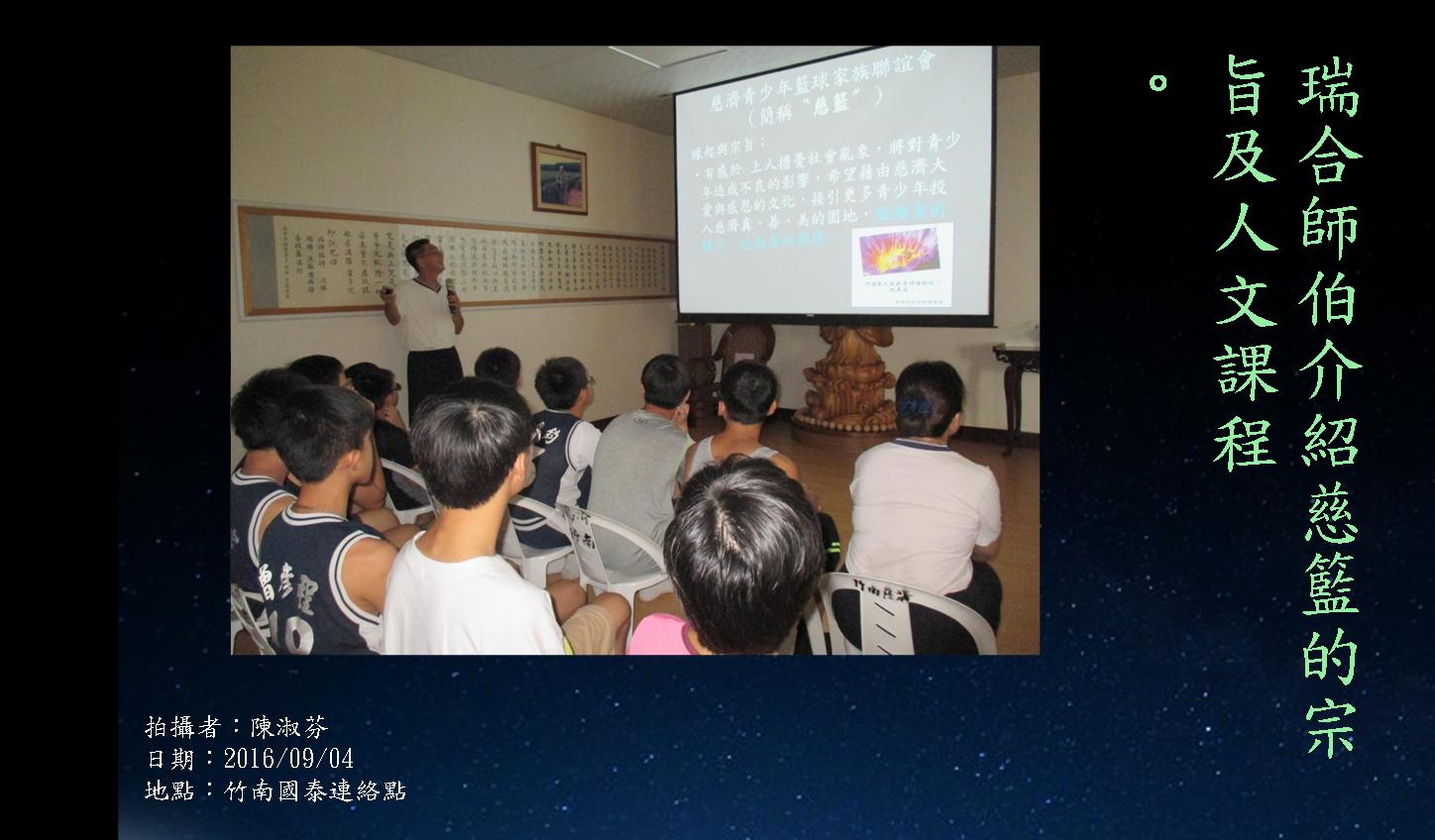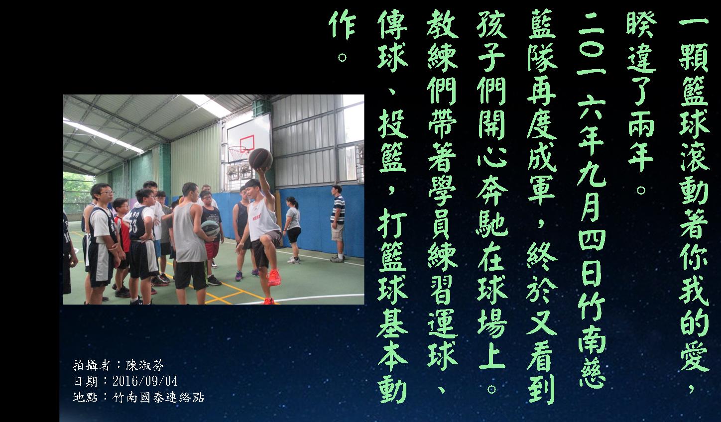 二零一六年九月四日,竹南慈籃隊再度成軍,終於又看到孩子們開新奔馳在球場上。教練們帶著學員練習運球、傳球、投籃,打籃球基本動作。
