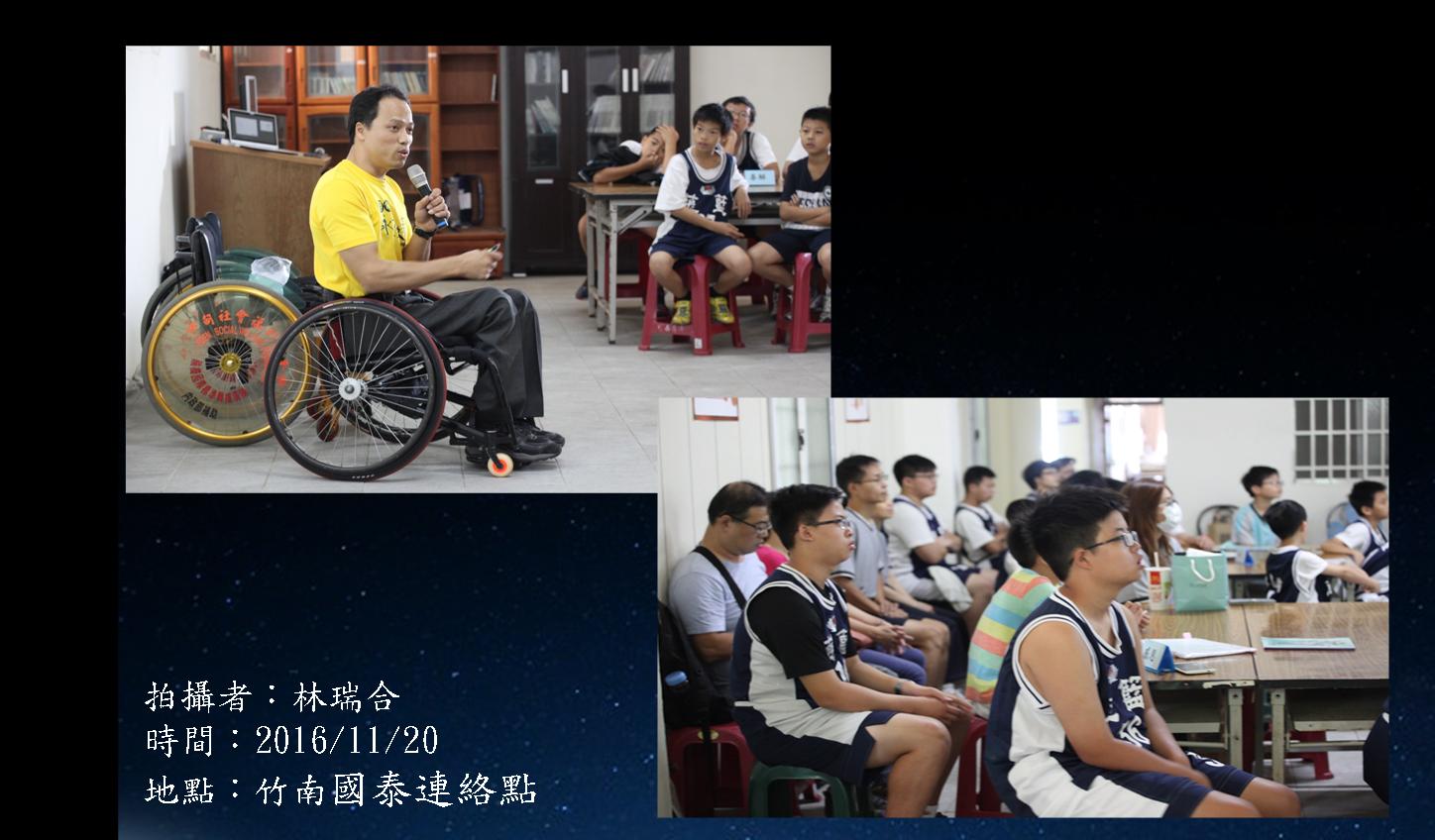 圖說:慈籃竹南組人文課程邀請呂豐和老師來分享,面對自己身體上的缺陷,也將自己的伙伴─輪椅。[攝影者:林瑞合]