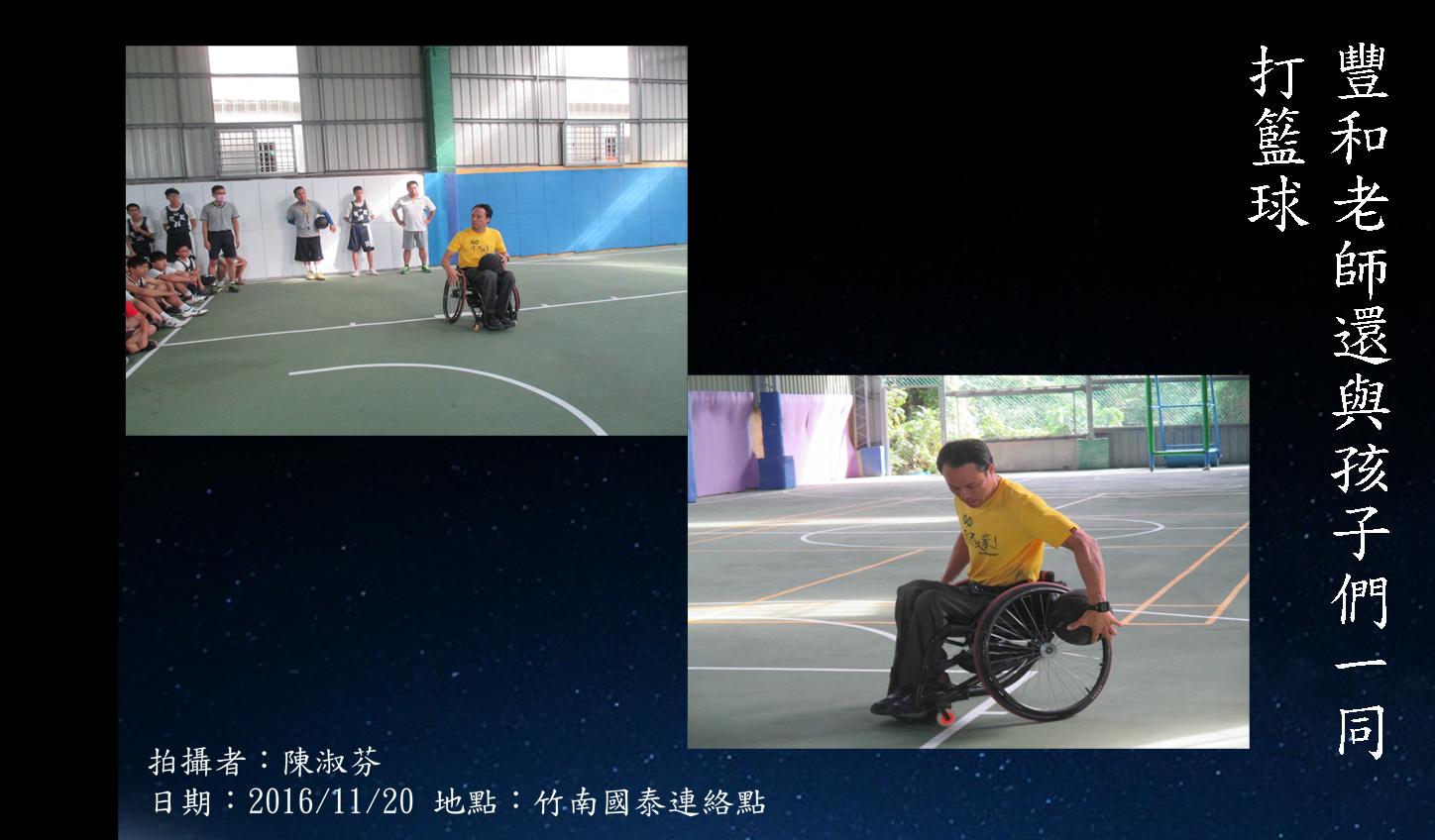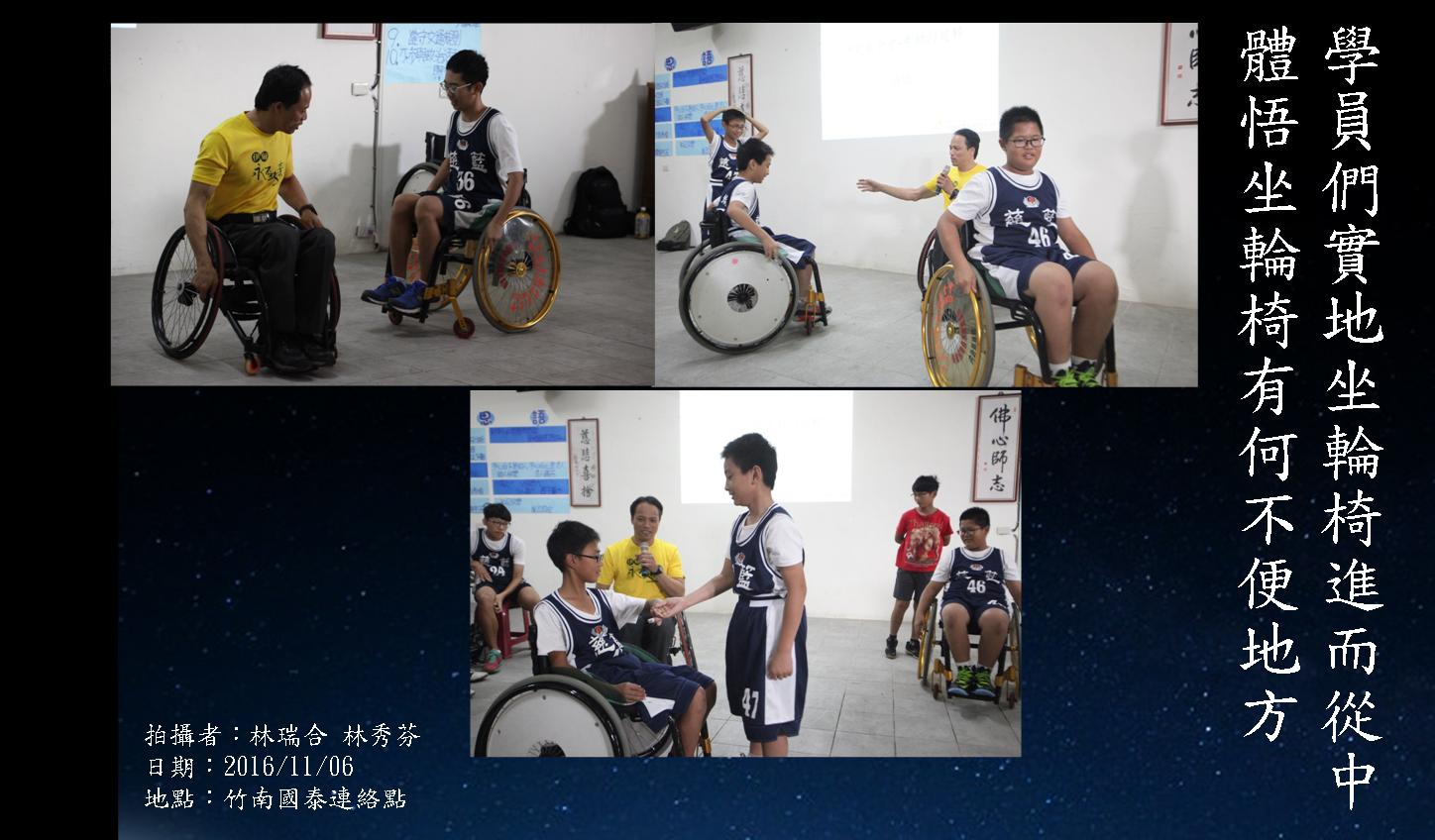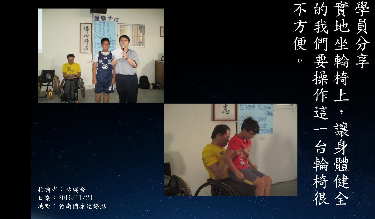 呂豐和老師分享面對自己身體上的缺陷,也將自己的伙伴─輪椅。曾經用輪椅參與亞運比賽,也用輪椅至荷蘭參加輪標舞,也讓學員們實地坐輪椅進而從中體悟坐輪椅的酸甜苦辣,豐和老師勉勵學員,碰到任何挫折及困難都不要放棄。