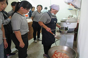 圖右 :隊輔人文課再次邀請竹南香積志工卜鳳嬌師姊素食家常菜並告訴大家如何利用天然的素材少鹽、少油又能吃得健康(蕃茄炒豆皮)。[攝影者:陳淑芬]