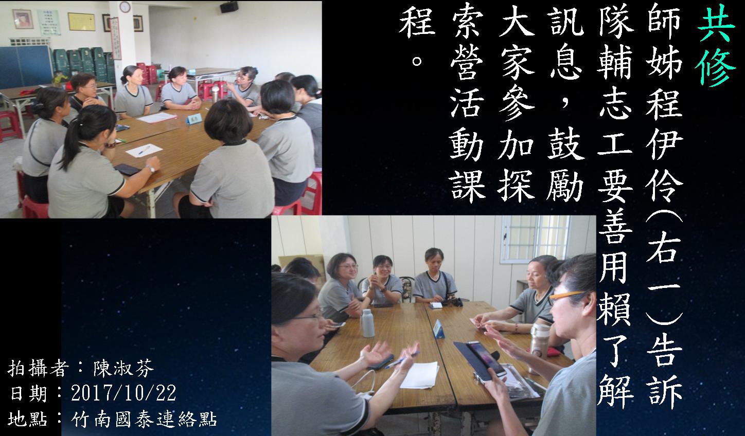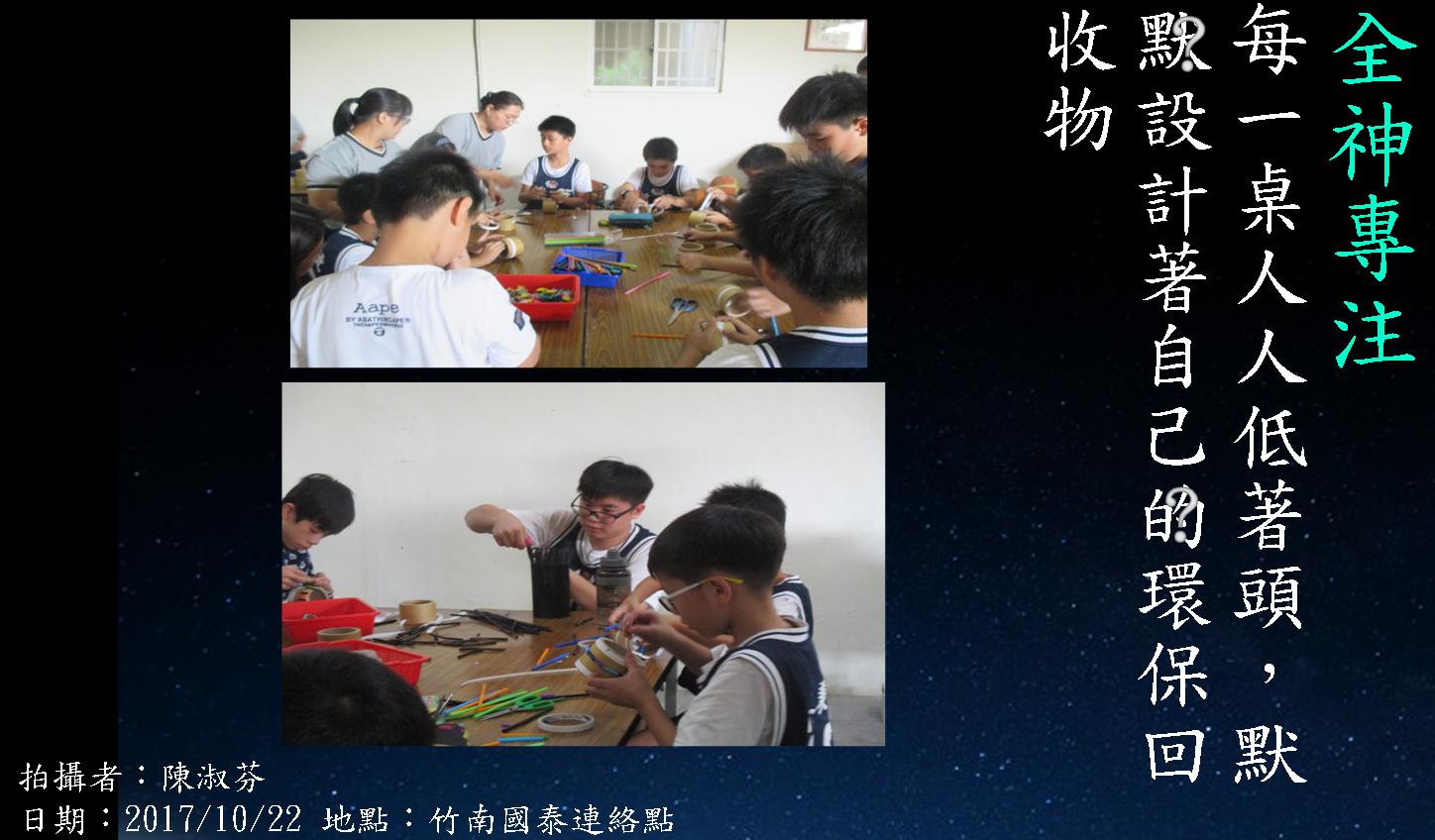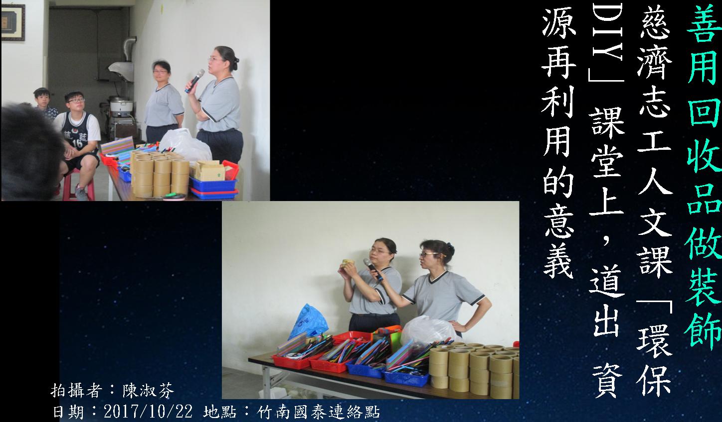 慈濟志工人文課「環保DIY」課堂上,道出 資源再利用的意義,每一桌人人低著頭,默默設計著自己的環保回收物