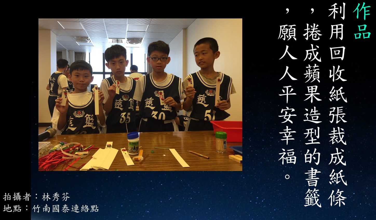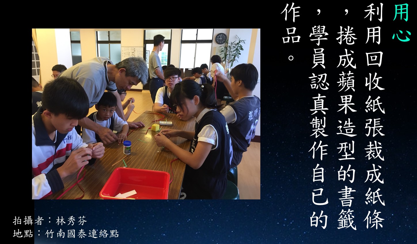 「愛地球很簡單,身體力一三五(用水省一點、一週三素、環保五寶碗筷提袋和手帕),教導學員利用回收材料做書籤。