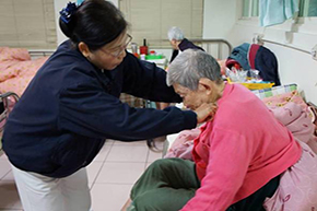 圖左 :志工幫長者整理服裝儀容