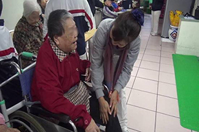 慈濟志工們一進門先來到房間,熱情的跟阿公阿媽打招呼,幫長者一一整理服裝儀容,學員們也很有默契,將阿公阿媽一一攙扶至大廳按摩聊天。