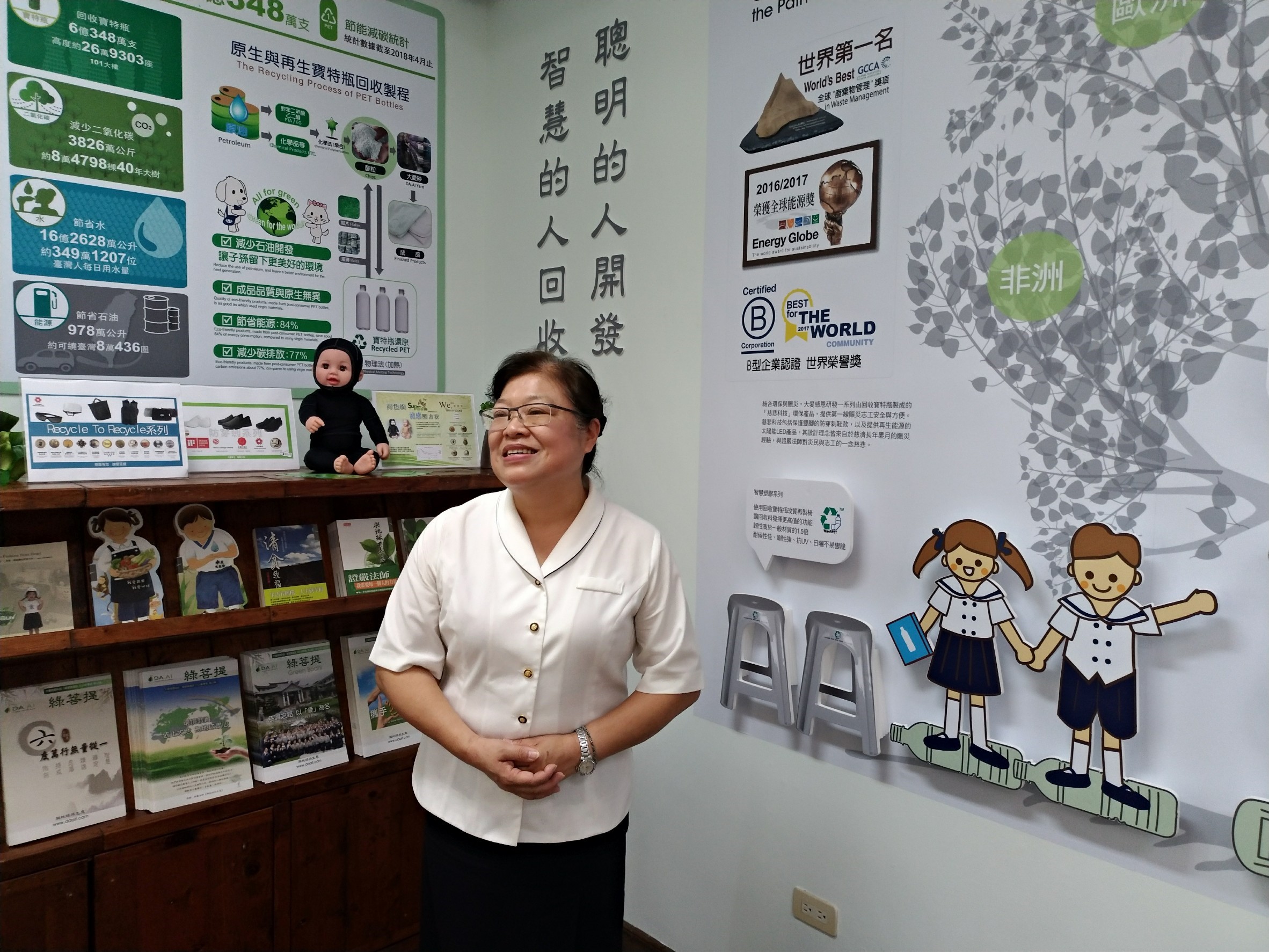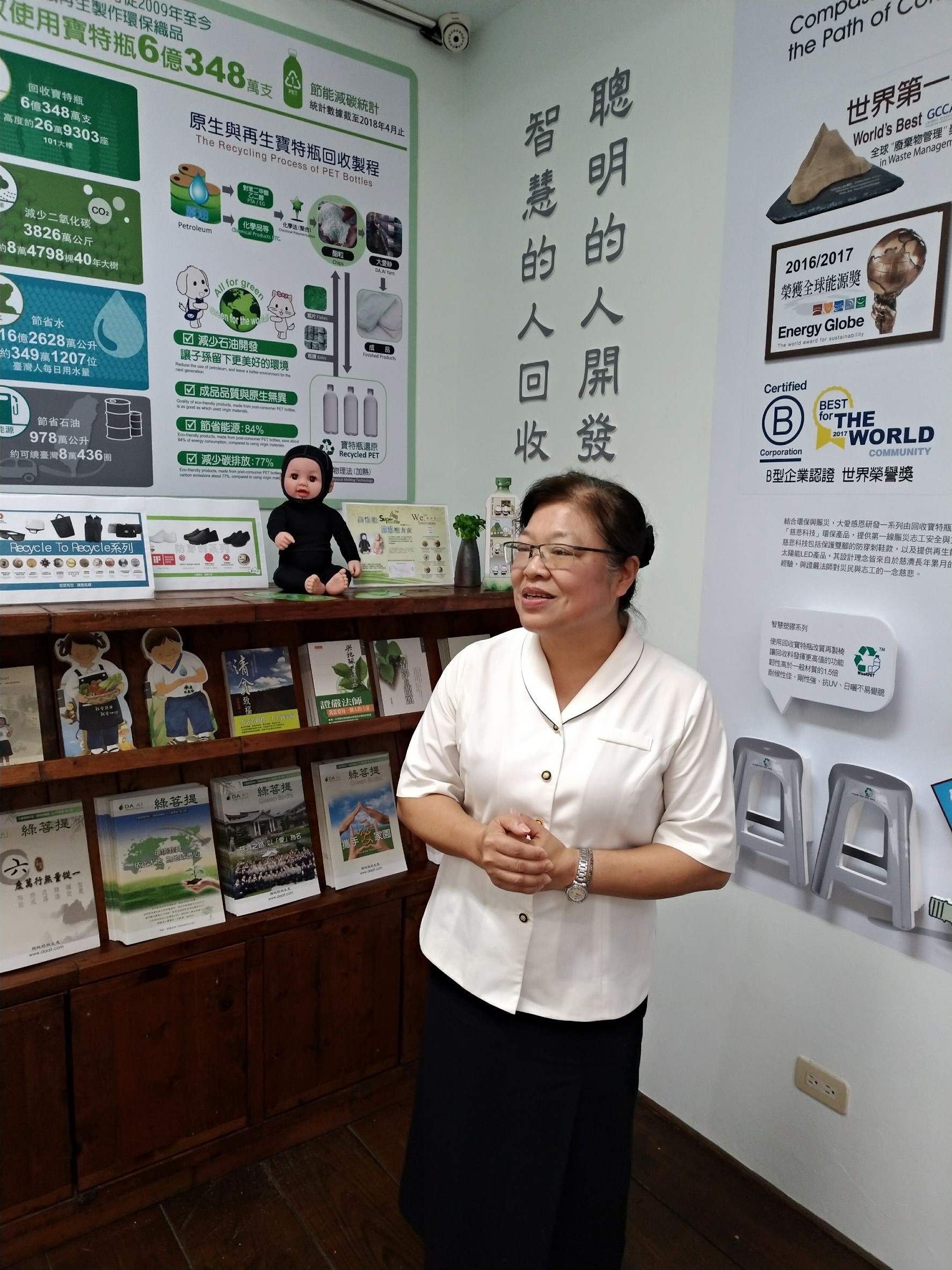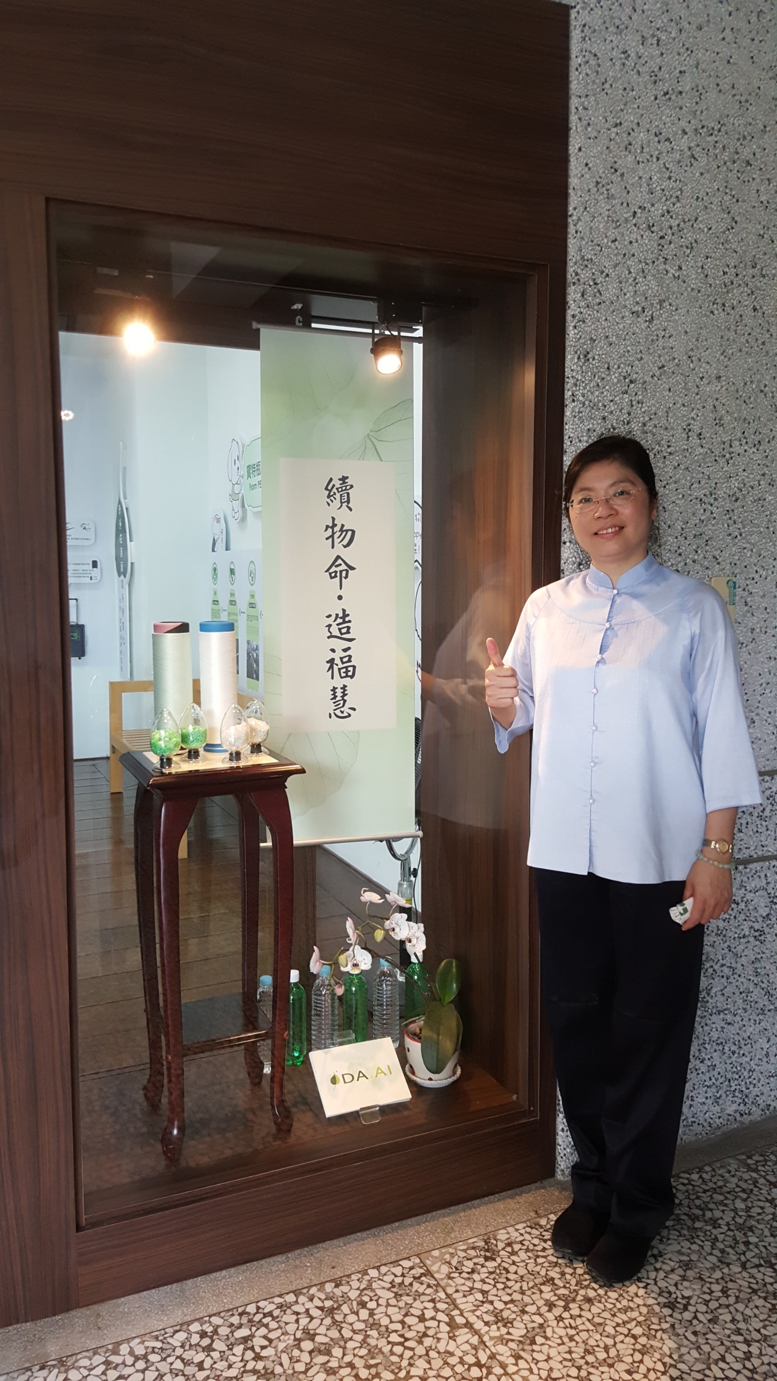 靜思書軒營運長 蔡青兒:「我們的精神來源來自於上人的心, 上人的方向, 所以靜思書軒給予一個方向, 都是上人的法 落實在慈濟宗門,就是在我們這個大愛感恩的館, 把它力行變成是,如何愛護這個大地 。」