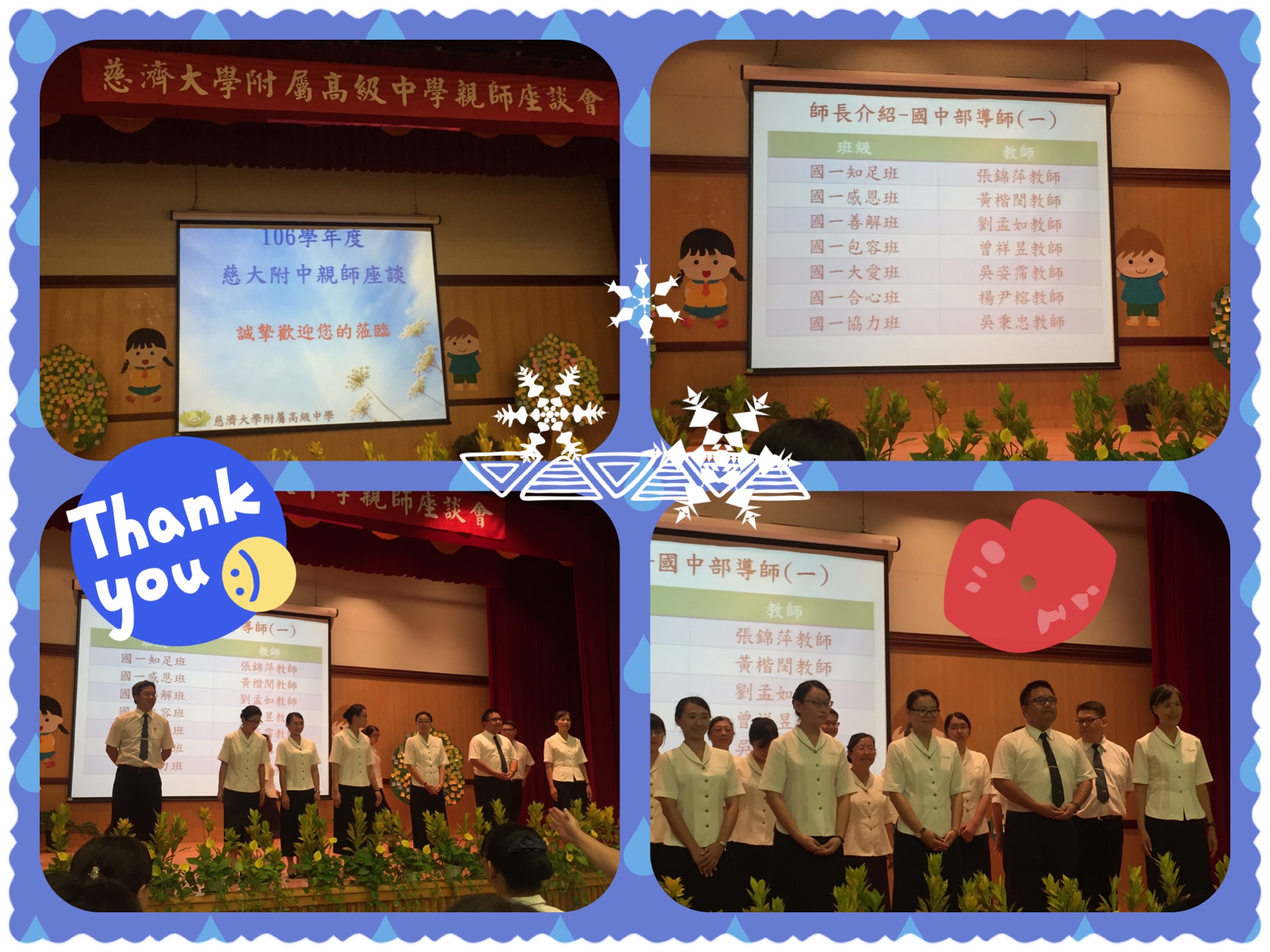 敬師謝師感恩茶會是由慈大附中慈懿會主辦,慈懿會爸爸媽媽在活動前為每位師長別上敬師的胸花,學生再以國際禮儀牽引全校師長依序通過「幸福門」,看到敬愛的師長如巨星般走進現場,學生們歡迎的歡呼及掌聲不絕於耳。「感恩、尊重、愛」是慈濟人文的展現,學生隊伍莊嚴整齊,帶著虔誠的敬意向老師行最敬禮,奉上清茶及茶點,並大聲對敬愛的師長們說:「老師,感恩您!老師,我愛您!」慈懿會爸媽也與師生一起演出音樂手語劇〈陽光眷戀的地方〉,慰勞老師平時的辛勞。另外送給師長們禮物,祝福師長平安吉祥、萬事吉利。最後慈懿會爸媽以法相贈,鞠躬致贈每位師長 證嚴上人的書籍,感恩師長用愛心照顧學生。慈中家長會長鄭景文會長在敬師茶會中同時表揚在校服務滿十年的師長們,頒贈榮譽獎座,感恩師長奉獻青春、付出血汗,在教育崗位上用心付出,期勉學生人人誠懇踏實、守志奉道,認真學習,「大地有愛,人間有情」,希望慈中師親生珍惜因緣,相親相愛,情義綿延。活動結束後,緊接著是最期待的溫馨家聚時間,一個月一次的家聚時間總是覺得特別的短,爸媽們總是份外的珍惜跟孩子們相處的時光。