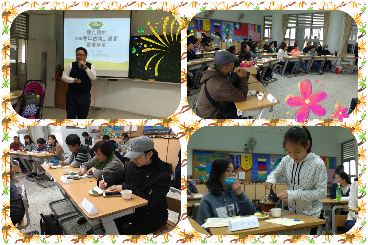 這次慈懿日活動,慈懿會安排全球總督導黃思賢師兄與呂宗翰師兄分享「我們說著共同的語言-墨西哥地震賑災之路」揭開了此次活動的序幕,精彩的分享內容,讓慈誠爸爸懿德媽媽收穫滿滿,尤其思賢師兄這句「看得透,忍不過,想得到,做不來,是因為功夫不夠」真是經典佳句。緊接著用完午餐爸爸媽媽迫不及待來到教室與孩子們相聚話家常,因應寒食節活動準備包潤餅讓孩子親身體驗這個節氣的意義,孩子們個個活潑的與媽媽們互動,整個家聚時間就在溫馨熱鬧的氣氛之下劃下完美的句點。隔天的班親會爸爸媽媽不辭辛勞遠從各地來參加,用心的想了解寶貝在學校的生活點滴與學習情況。