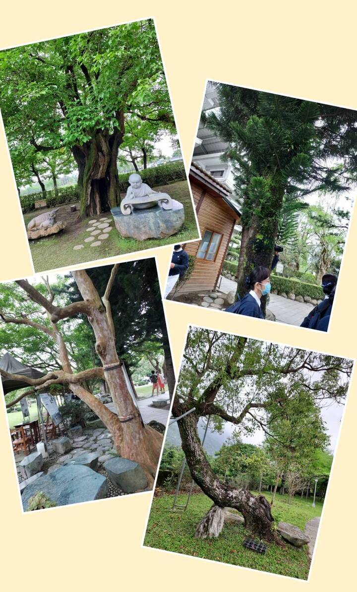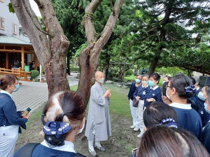 邁師父最後帶大家來到戶外的園區,師父解說麵包樹7、8月會結果,果實也是早期精舍師父食物來源之一。接著來到茄冬樹下,師父請大家去踏不同地方的草皮有什麼不同的感覺?就是在告訴大家,在人群中要不斷磨練,自我調整,修除習氣,要禁得起修練,才能越磨越圓融。