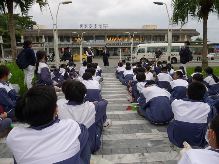 我們班與國一大愛班,清掃後火車站周邊環境,到站後,蕭主任邀請了花蓮站站長為大家加油打氣,站長感恩 上人在此地創辦功德會,蓋醫院為花蓮鄉親帶來了醫療的便利,也帶動了花蓮的繁榮與人文的素養。