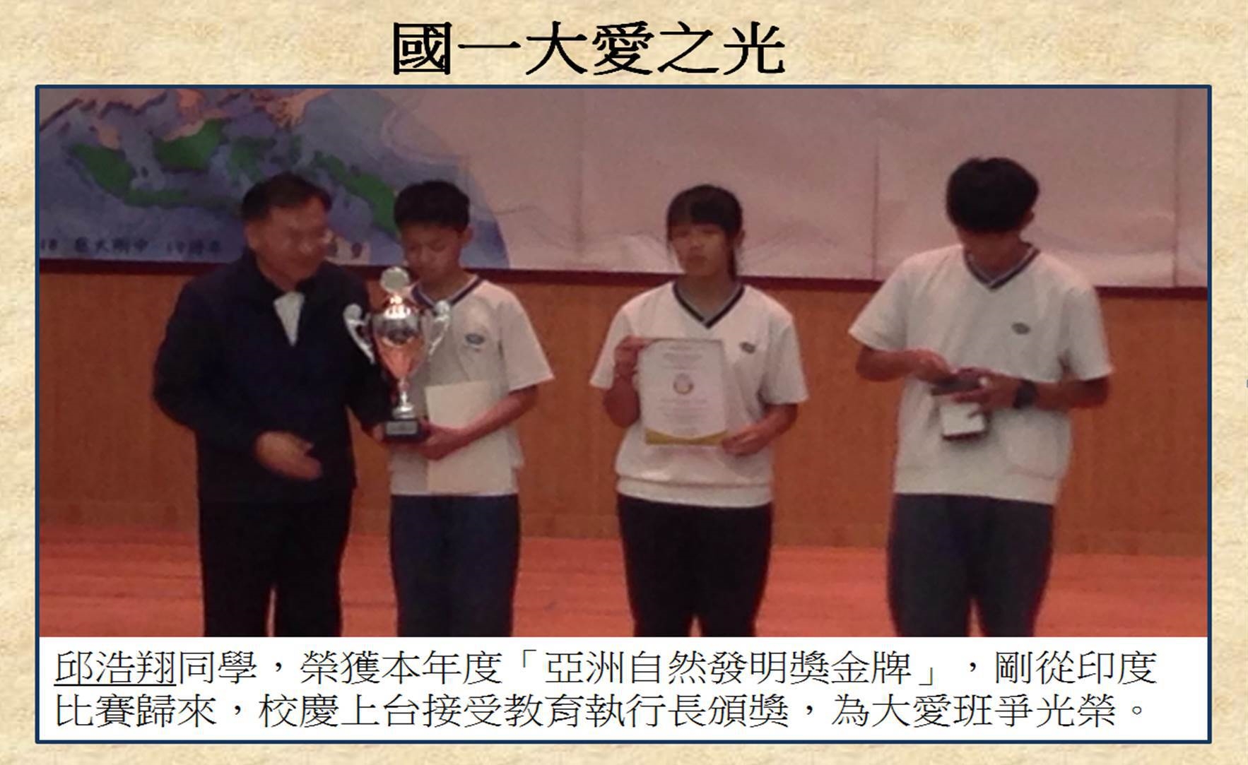 此次校慶亦頒發「服務十年教職員獎」,本班陳英仁導師與夫人,均上台接受表揚;另外本班邱浩翔同學前往印度參加「2018年亞洲發明獎」金牌,為國一大愛增添無上光榮。