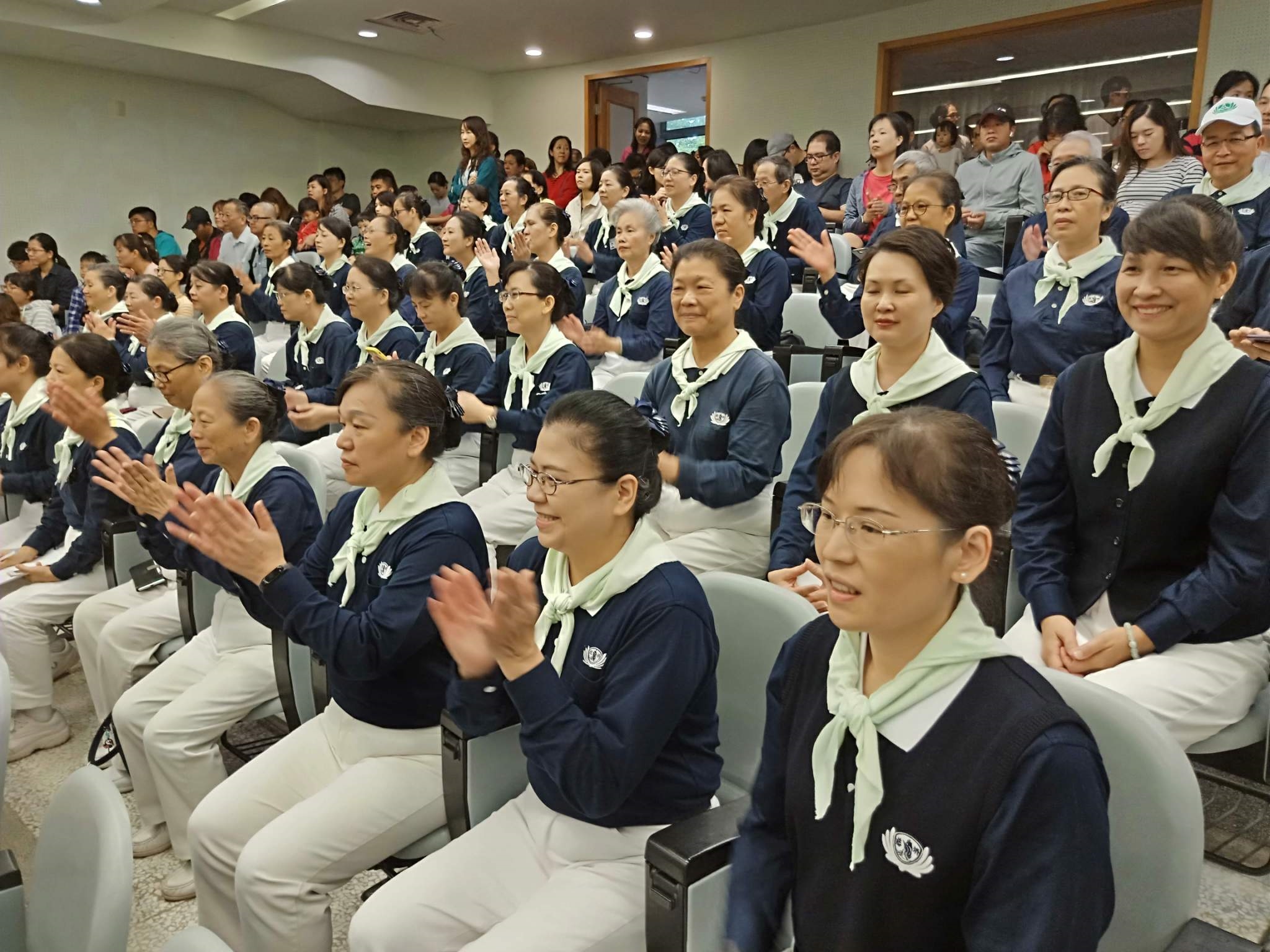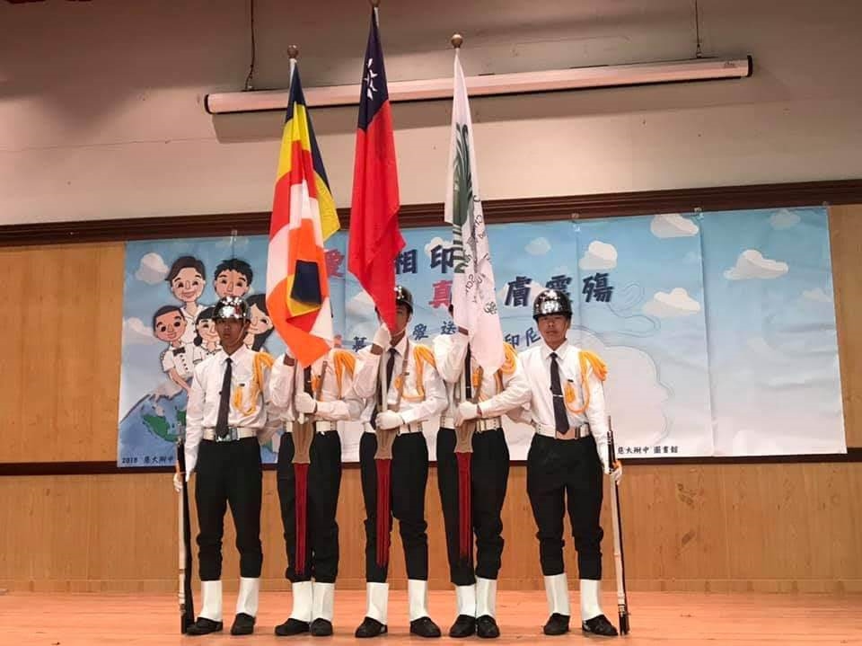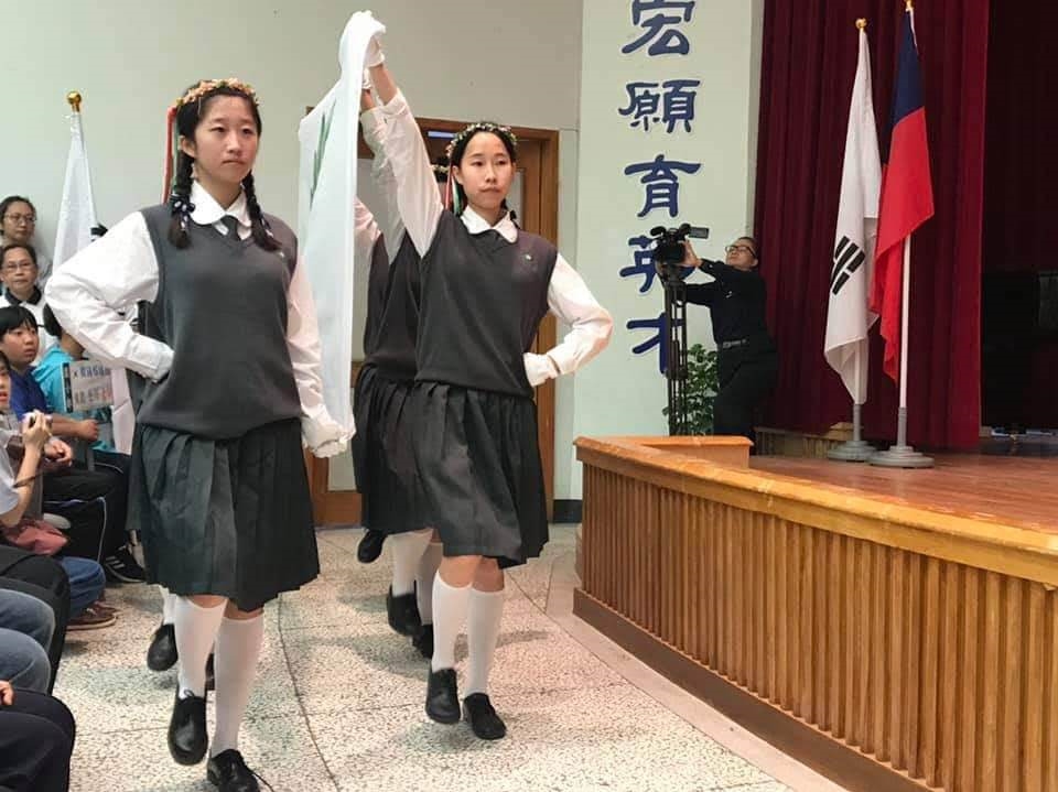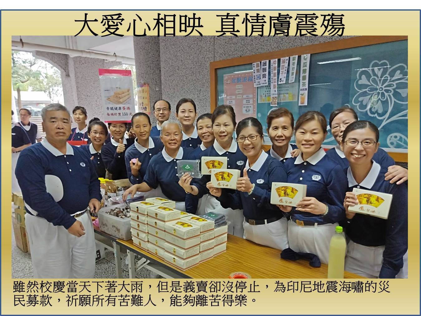 昨晚睡夢中,就聽到雨聲忽大忽小,滴滴答答的,心想祈願早上雨就停,但早餐時,滂沱大雨開始劈哩啪啦的下,學員長叮嚀,暫時安住在餐廳,聽候學校晉級會議的結果,消息傳來,運動會取消,但義賣照常舉行,只是原來在戶外的場地,移至保健中心旁的空地,繼續舉行;校慶典禮,也移到演藝廳舉行,只是各班的班排與班旗參加,其餘同學在教室看轉播,懿德媽媽60位參加,因為在演藝廳要表演「大地和風」拳;校慶就在校長姊姊主持下開始。