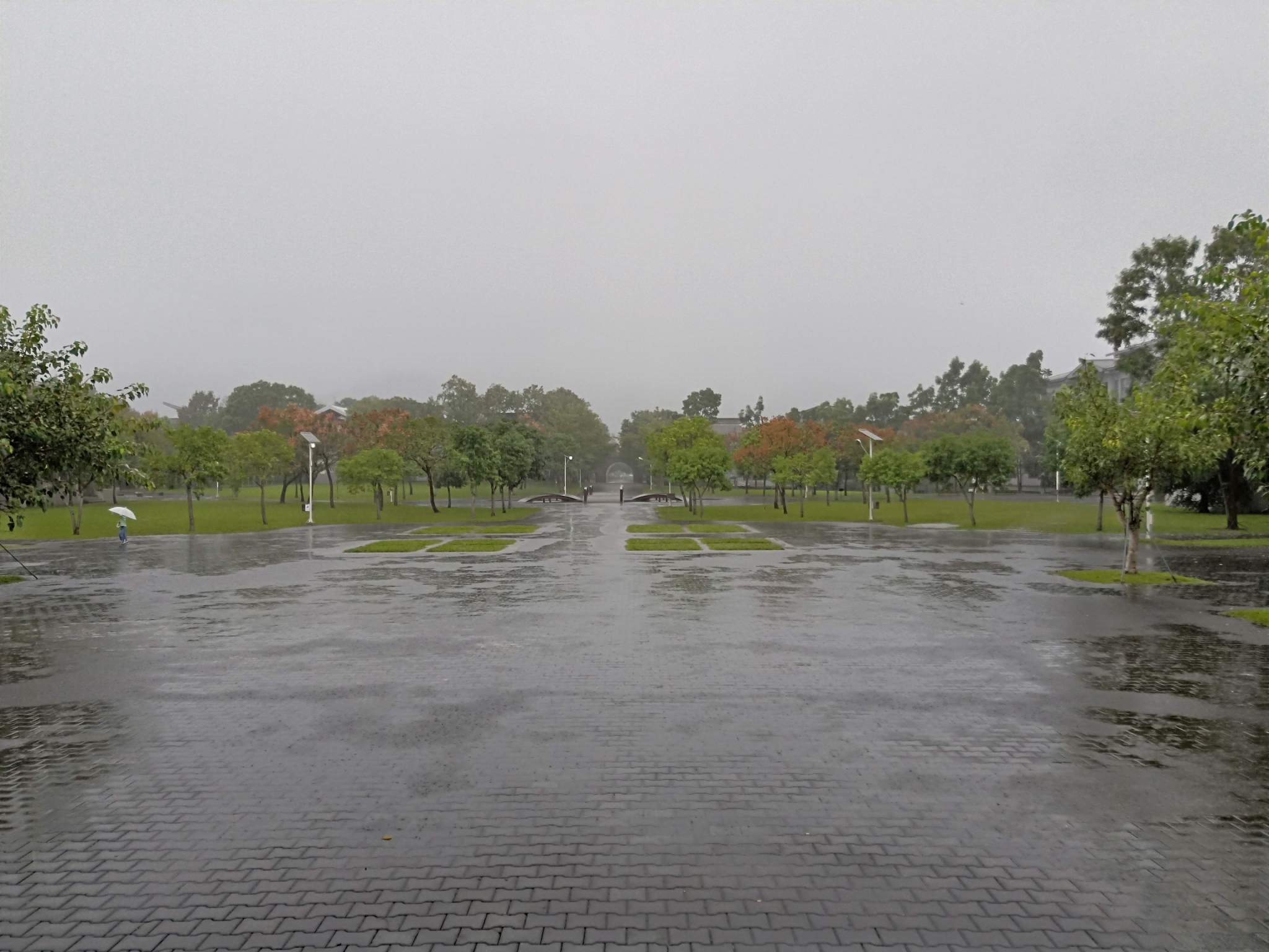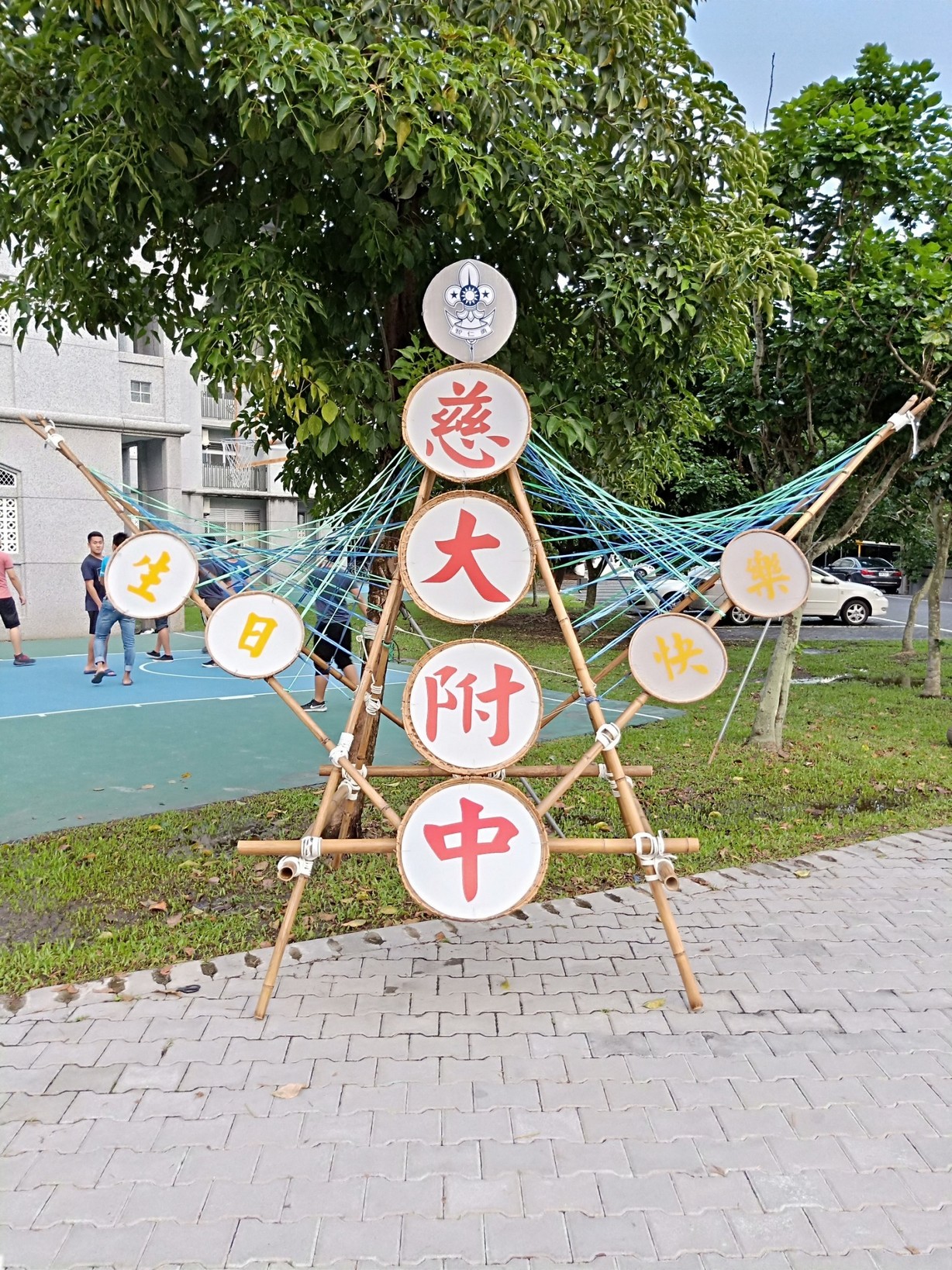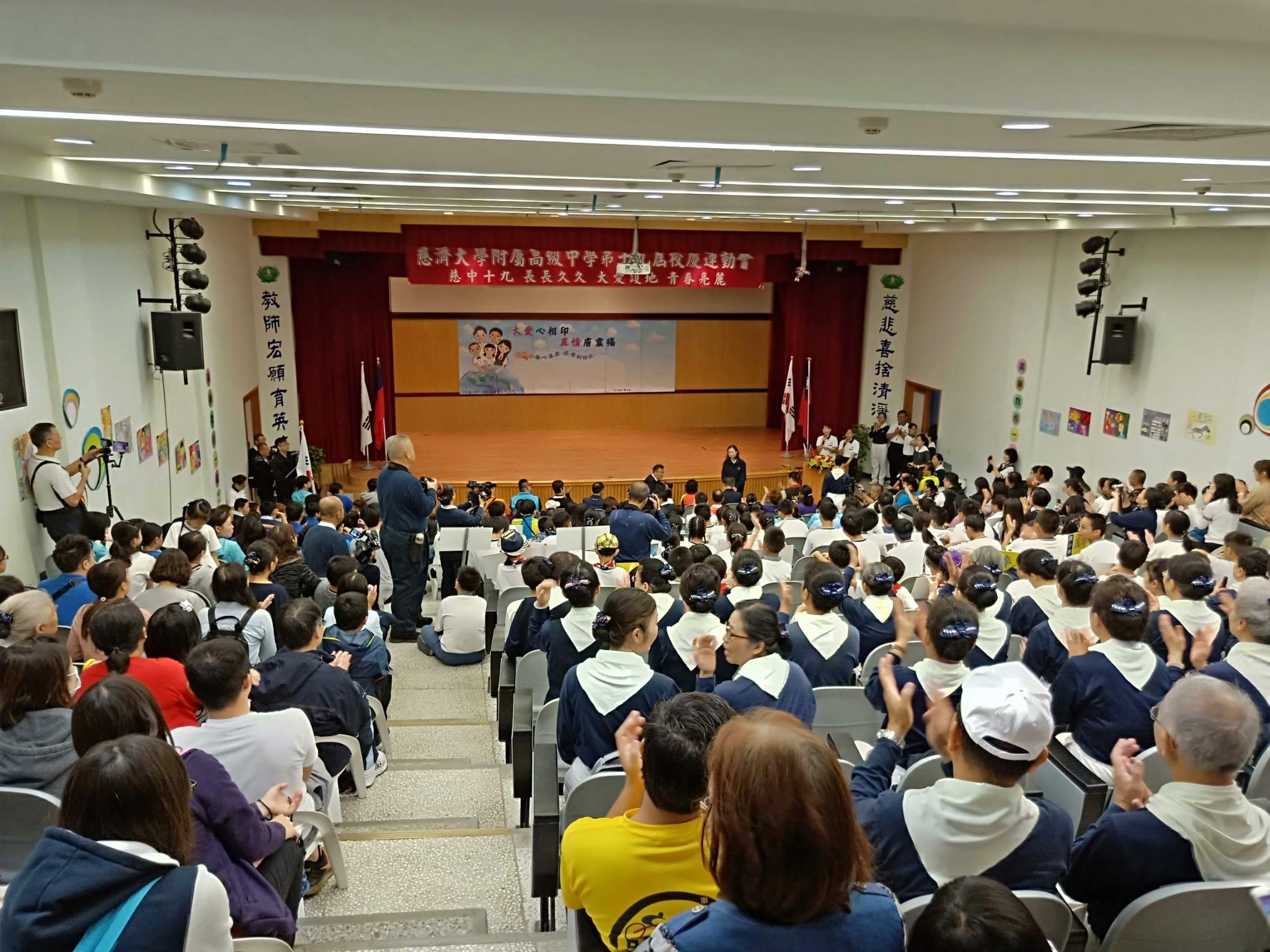 昨晚睡夢中,就聽到雨聲忽大忽小,滴滴答答的,心想祈願早上雨就停,但早餐時,滂沱大雨開始劈哩啪啦的下,學員長叮嚀,暫時安住在餐廳,聽候學校晉級會議的結果,消息傳來,運動會取消,但義賣照常舉行,只是原來在戶外的場地,移至保健中心旁的空地,繼續舉行;校慶典禮,也移到演藝廳舉行,只是各班的班排與班旗參加,其餘同學在教室看轉播,懿德媽媽60位參加,因為在演藝廳要表演「大地和風」拳;校慶就在校長姊姊主持下開始。