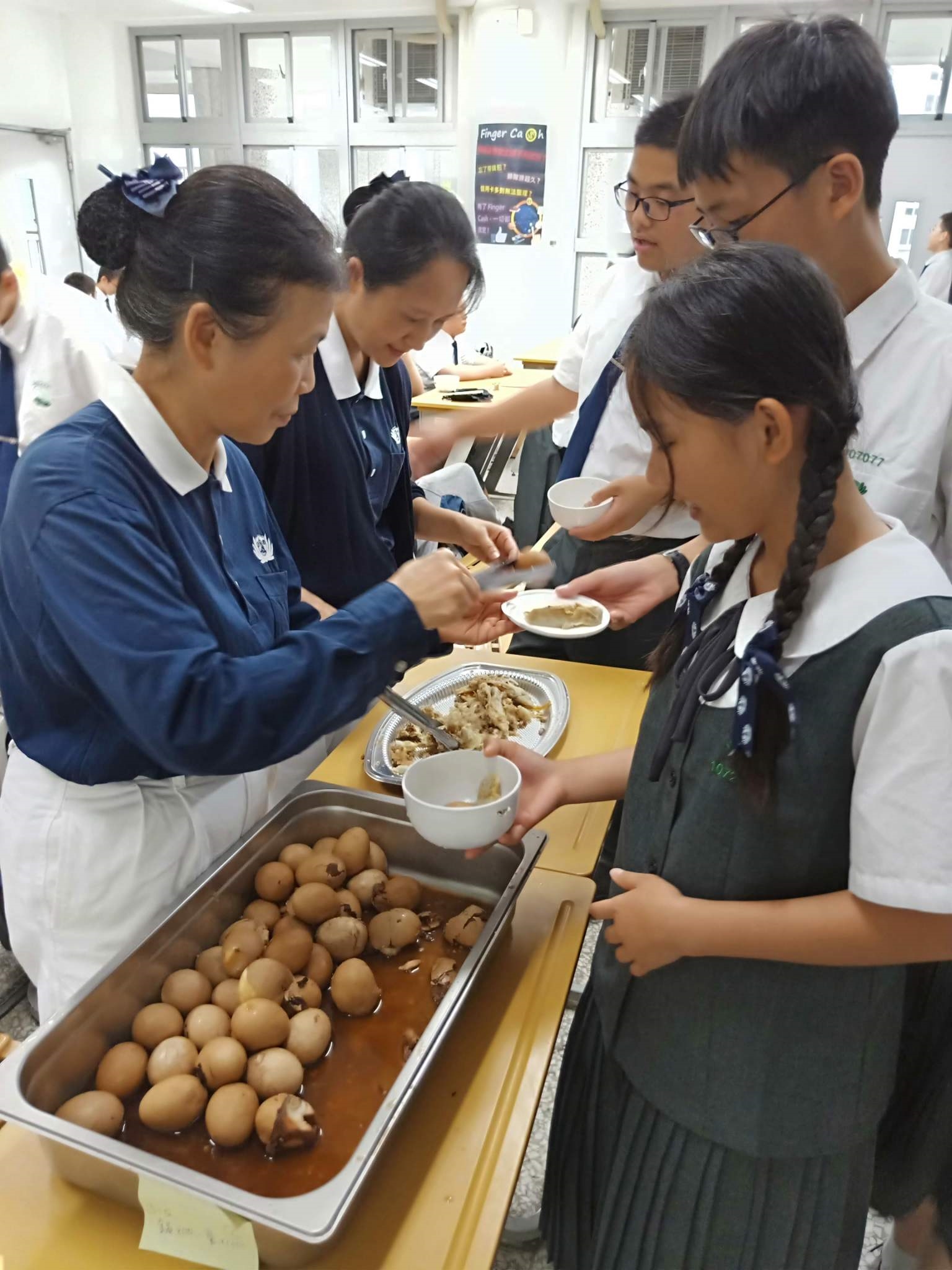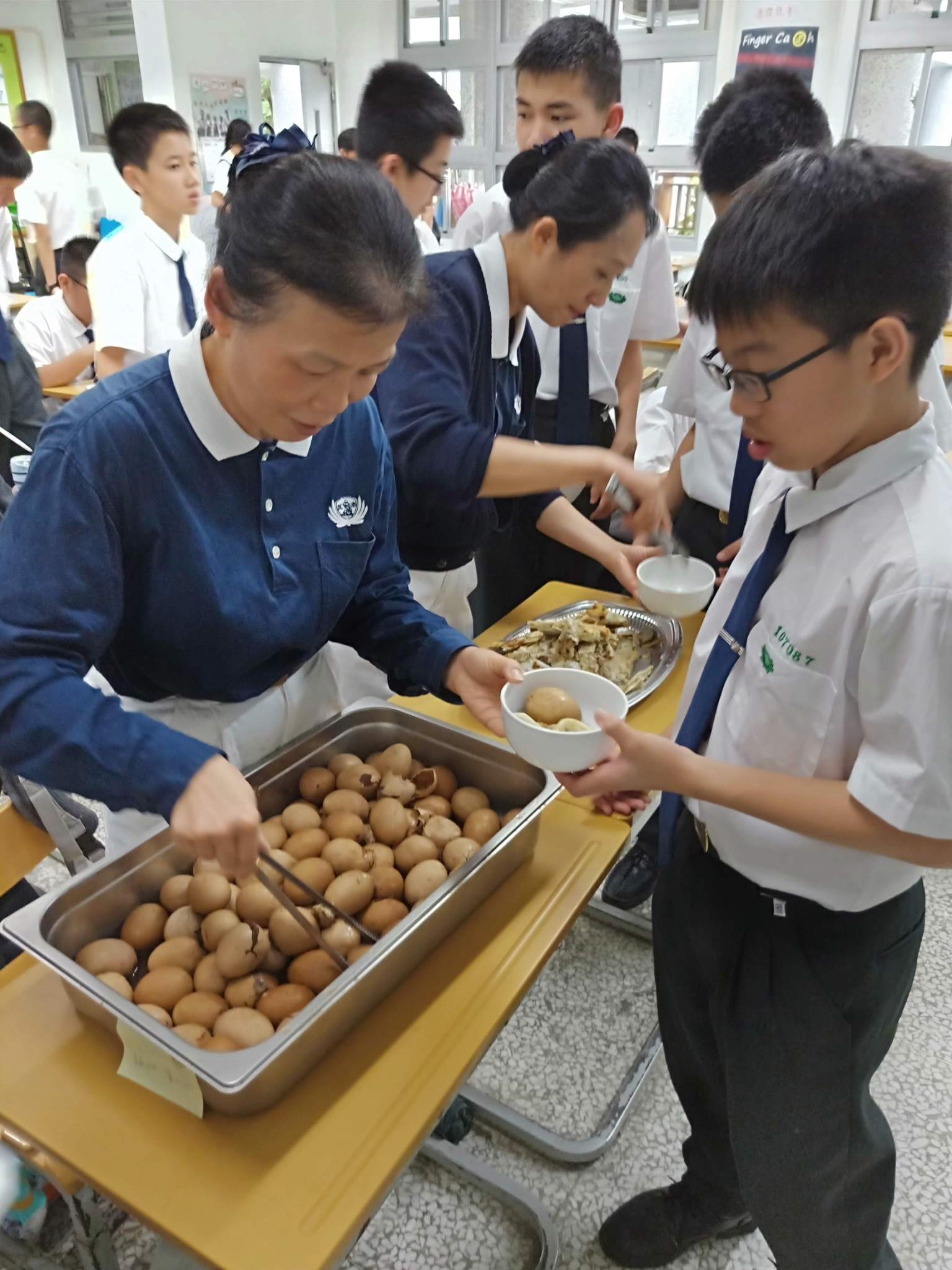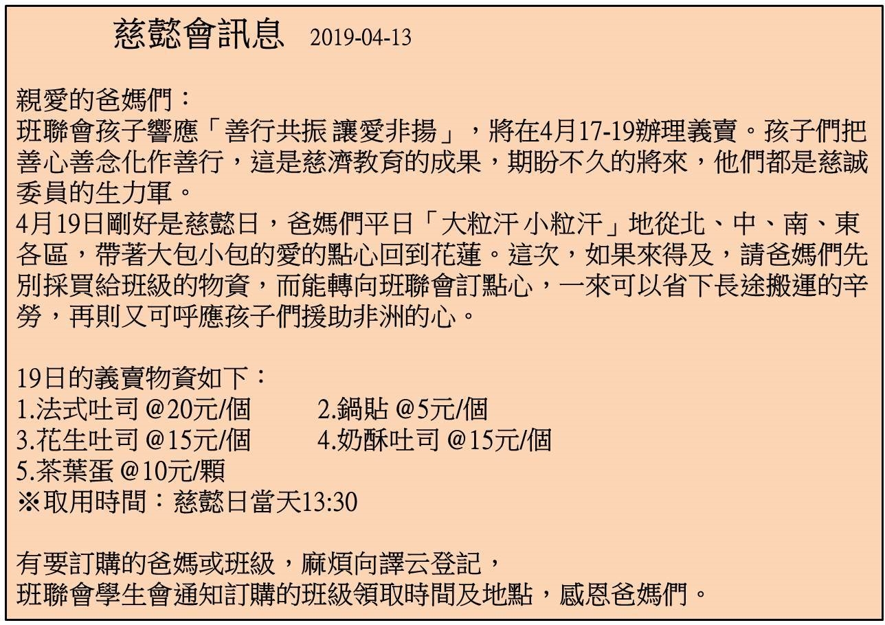 比賽結束,返回班上,在4/13慈懿會訊息,班聯會為讓愛非揚,希望慈懿日當天能選購他們的產品,本班爸媽採購煎餃100個,茶葉蛋100個,孩子們比賽得獎心情愉悅,付出愛心吃得更快樂,在大人小孩皆大歡喜下,結束了本次家聚。