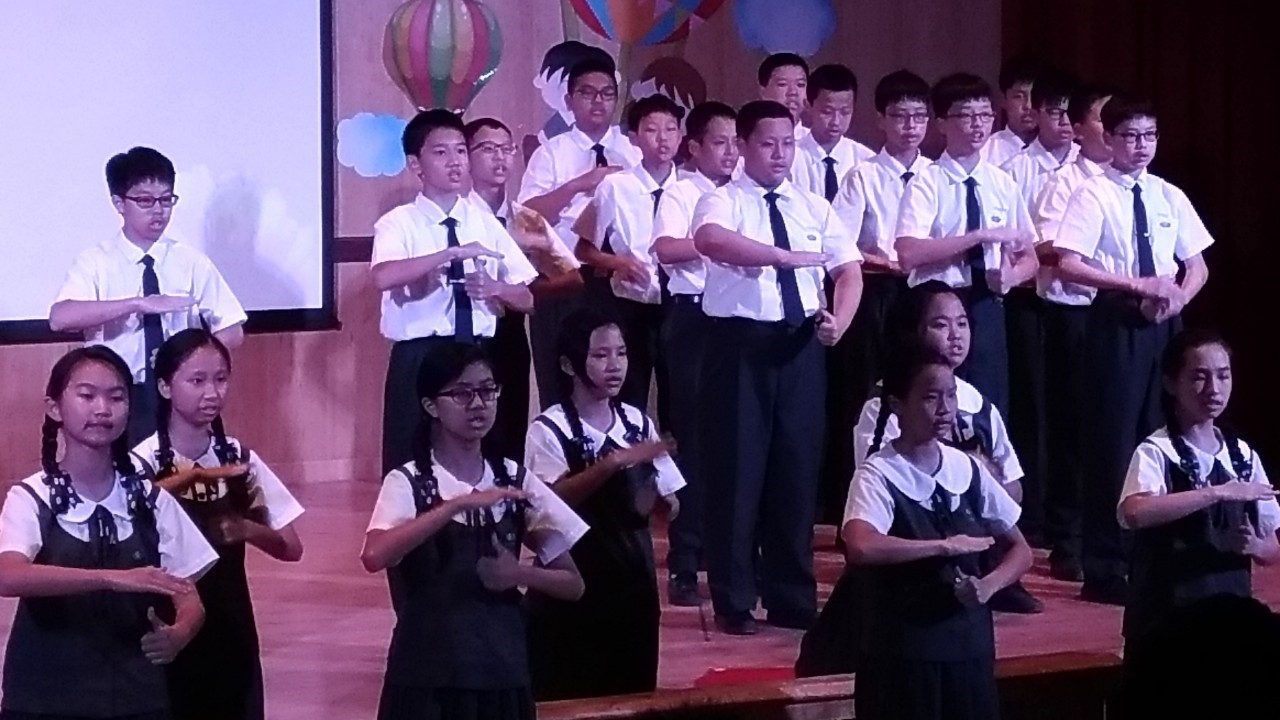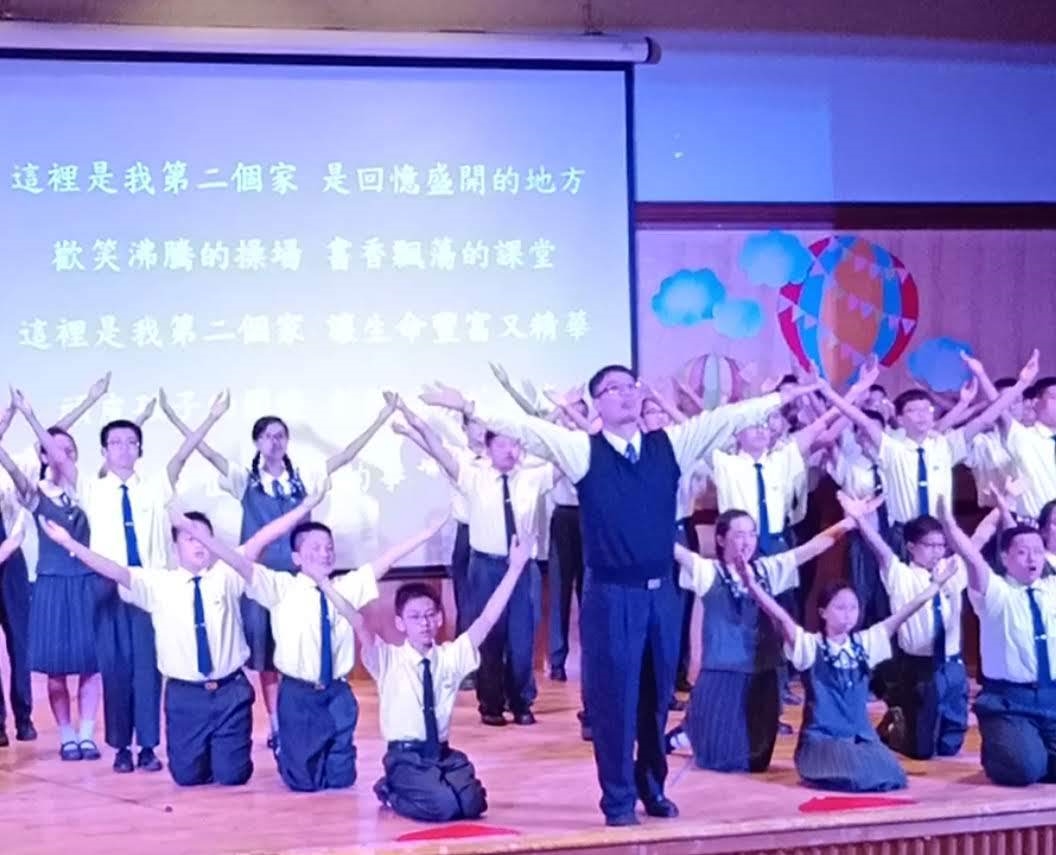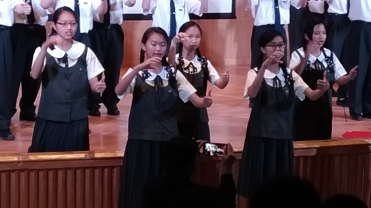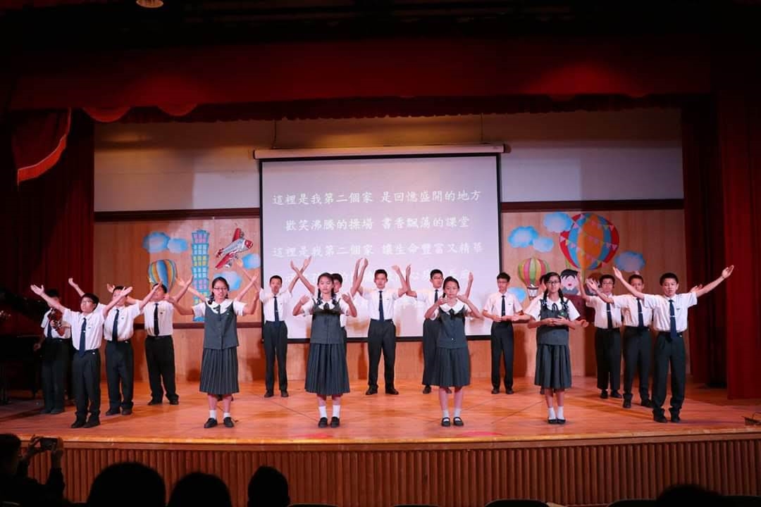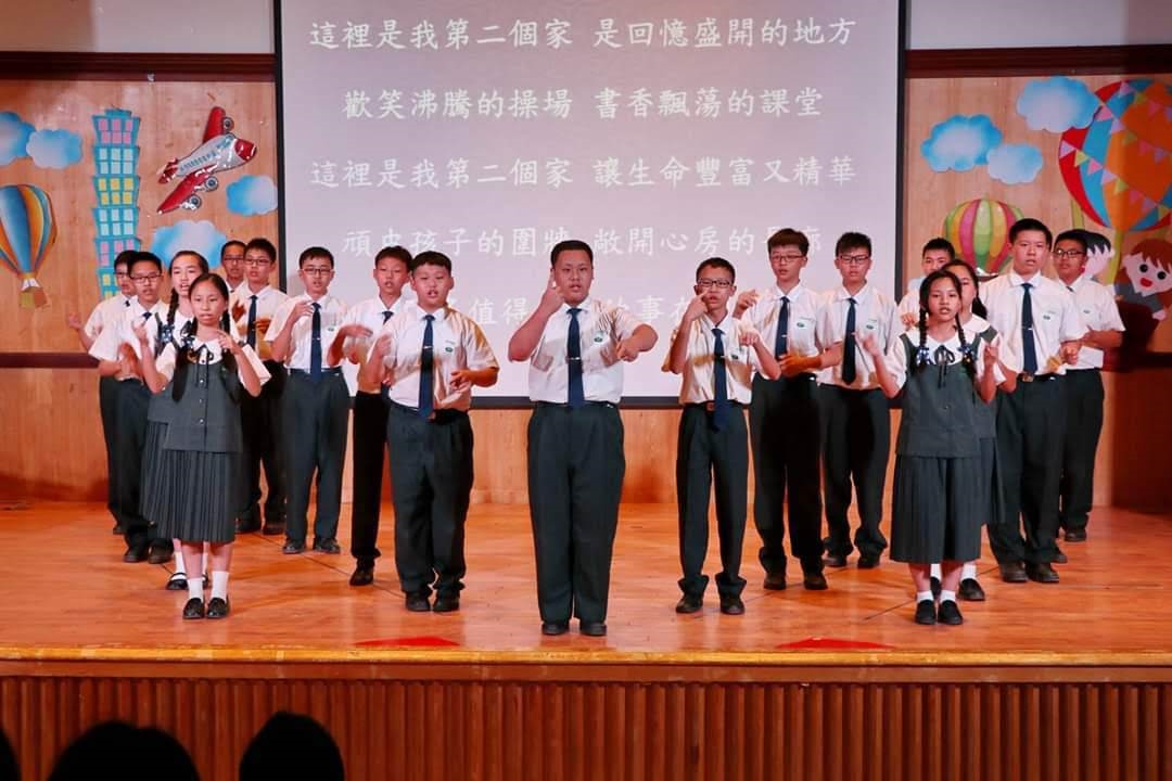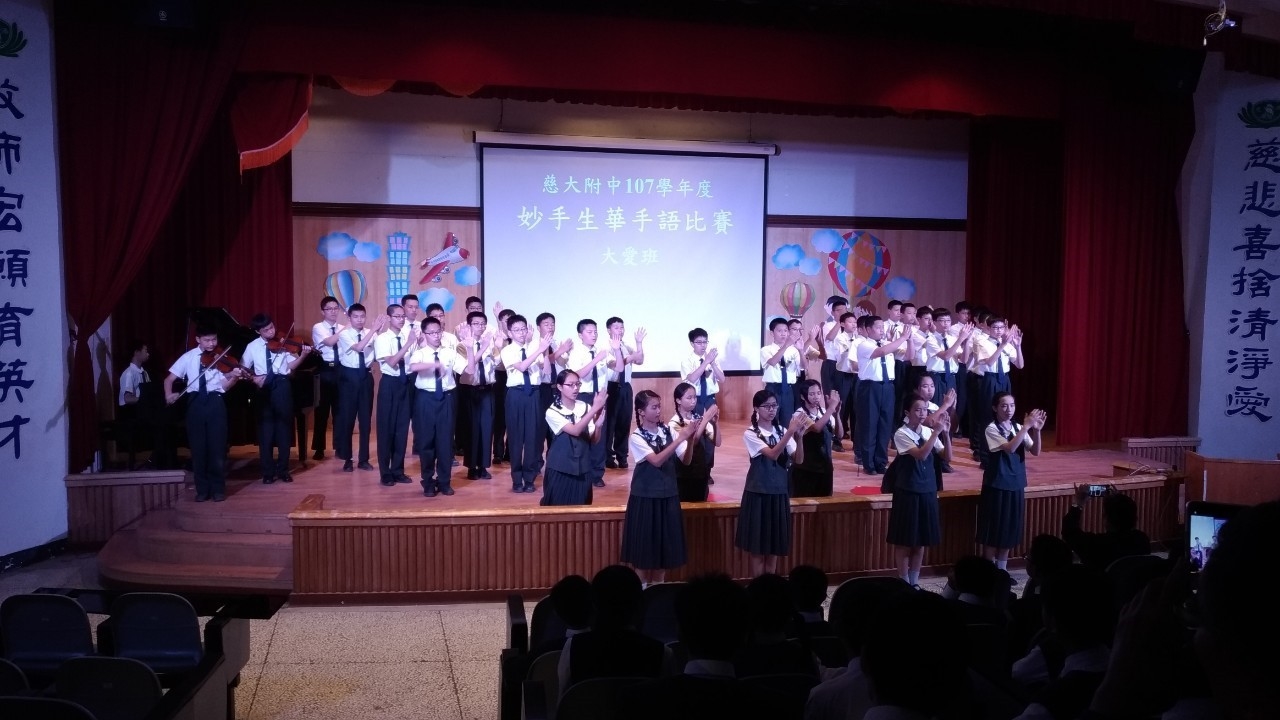 20190419當天慈懿日,家聚時間,國中一年級是手語比賽,在演藝廳,指定曲慈中校歌,本班自選曲「第二個家」;比賽前校長還要同學感恩爸媽的陪伴。