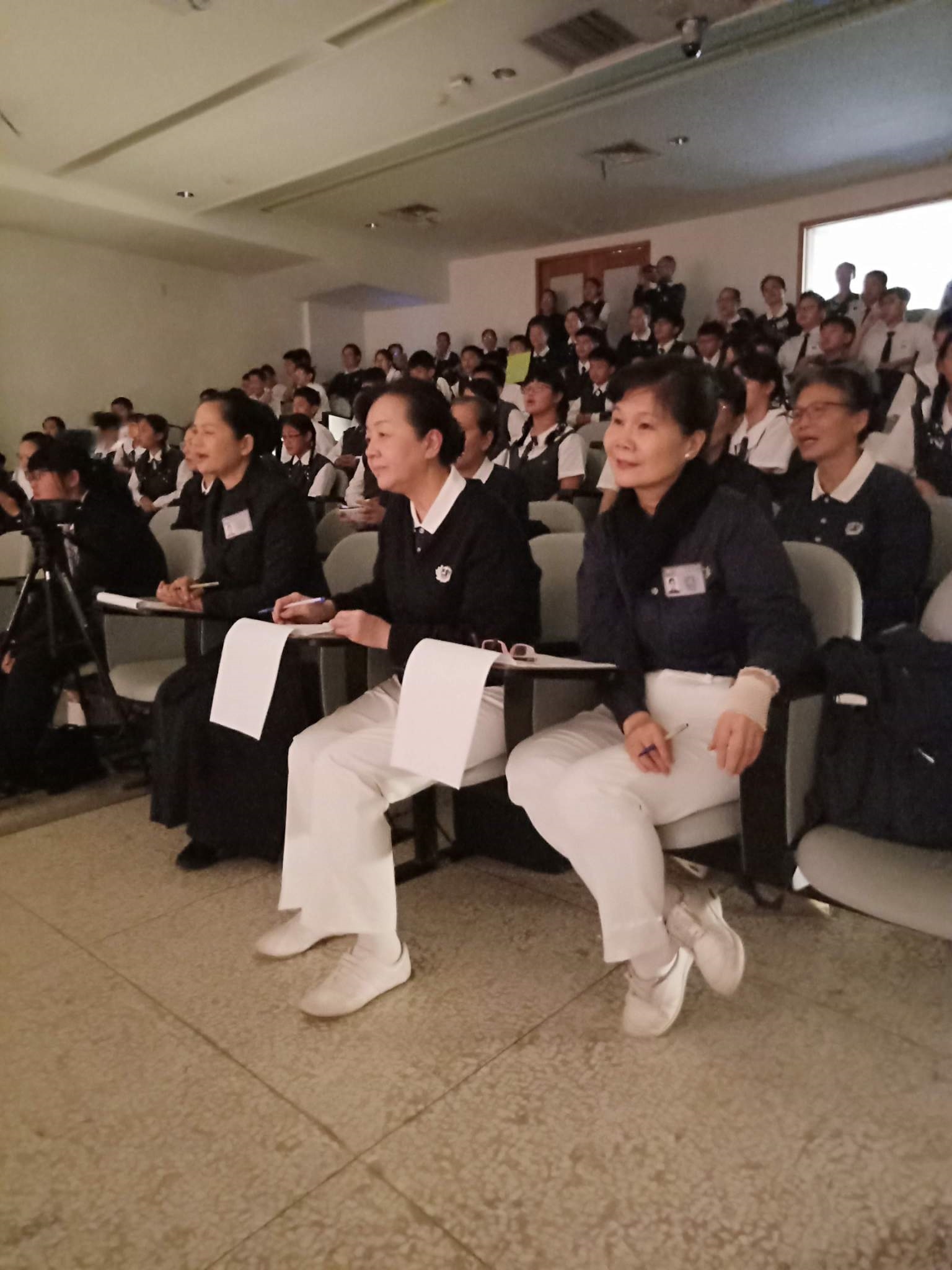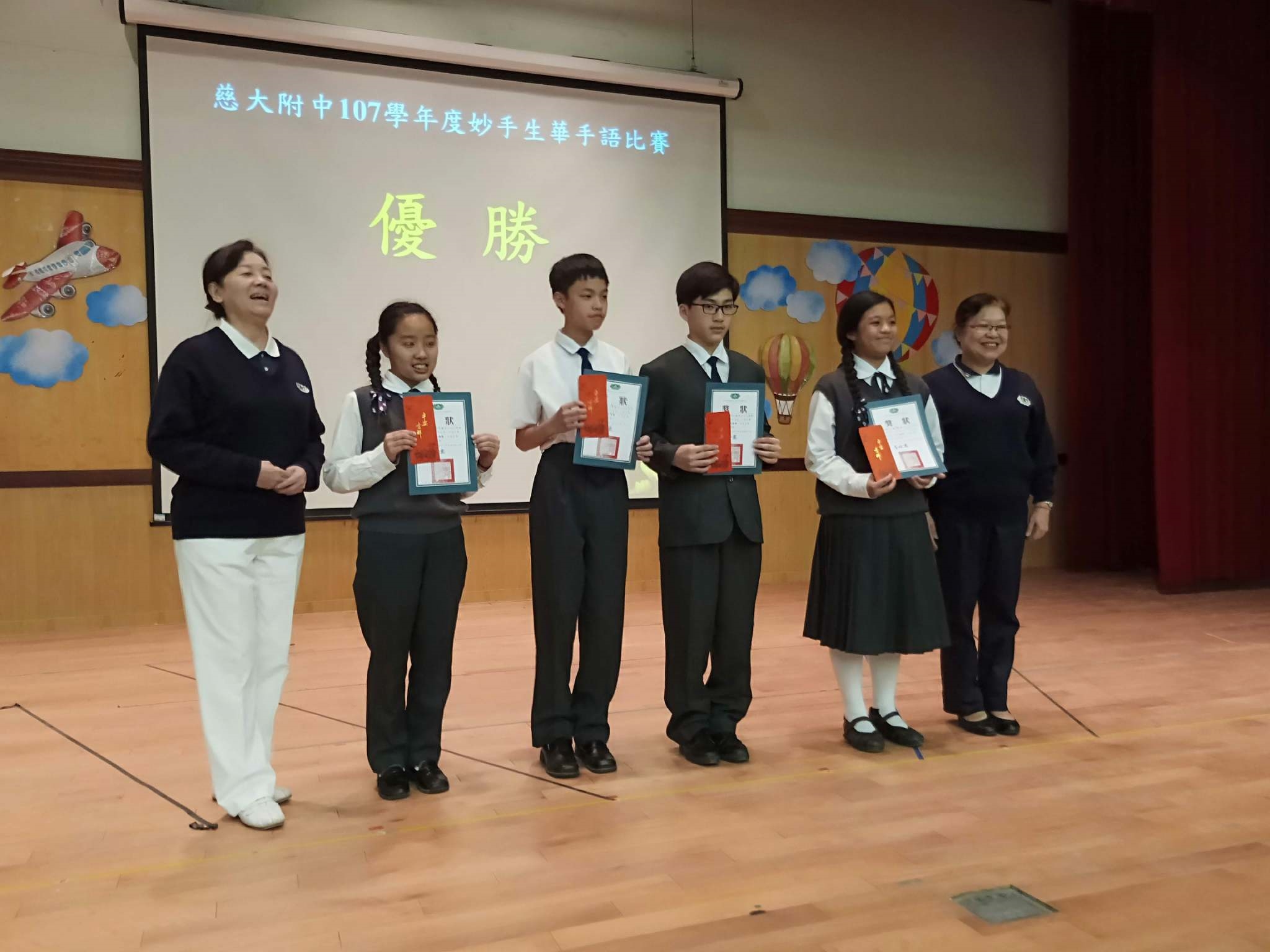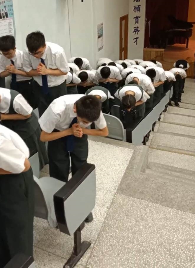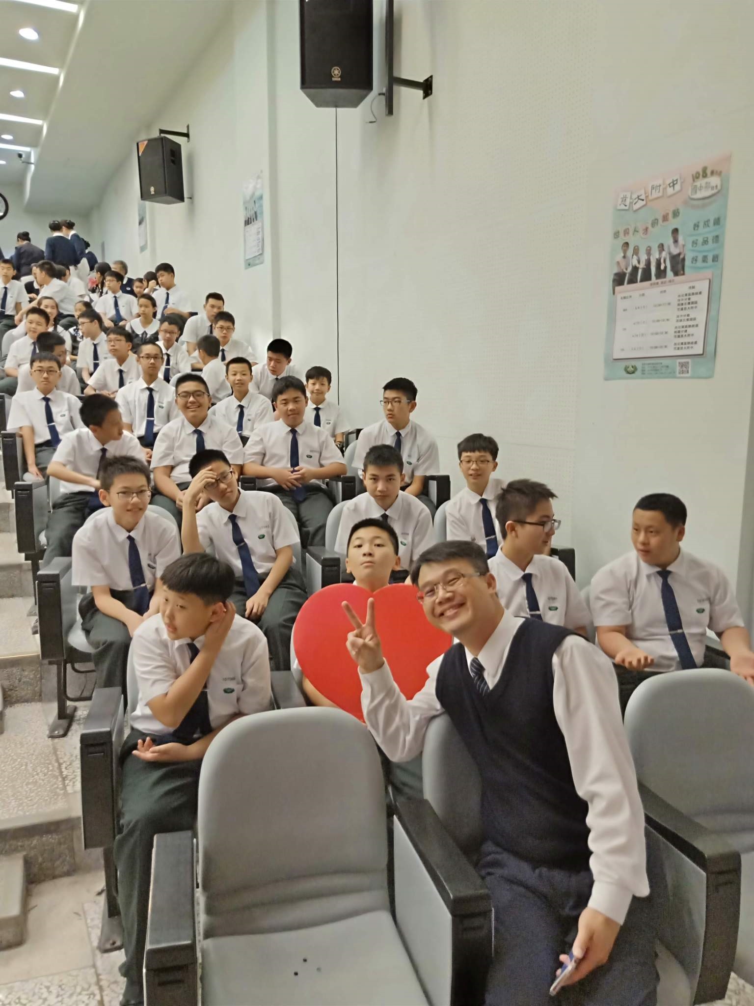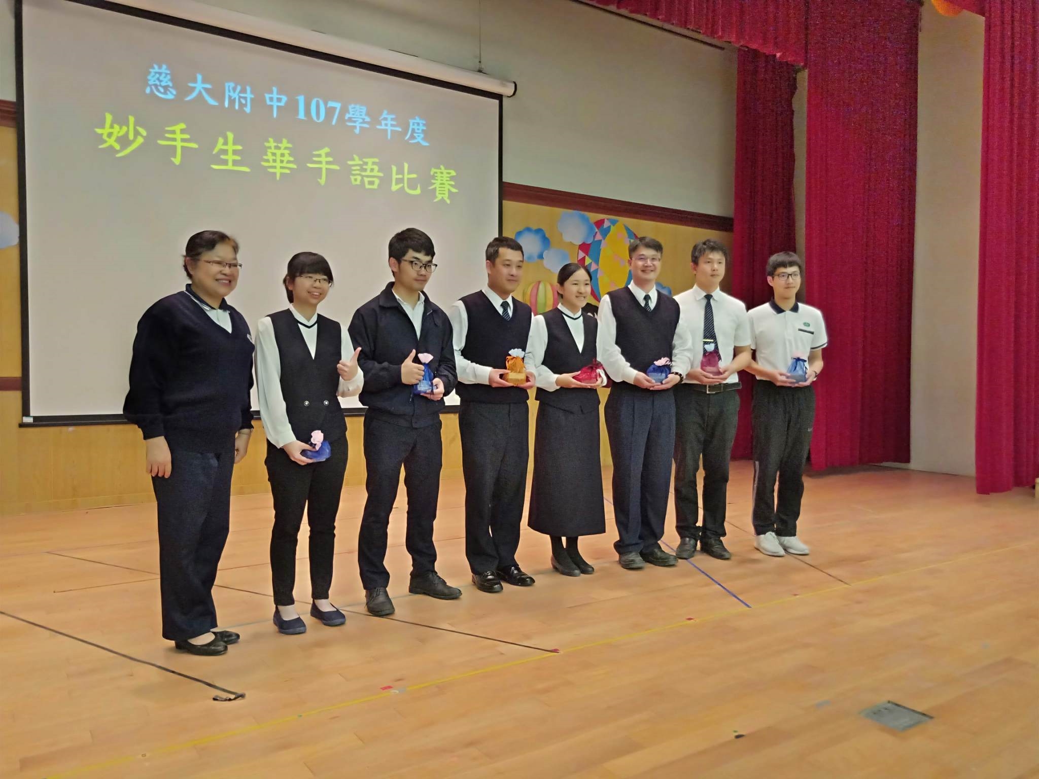 20190419當天慈懿日,家聚時間,國中一年級是手語比賽,在演藝廳,指定曲慈中校歌,本班自選曲「第二個家」;比賽前校長還要同學感恩爸媽的陪伴。