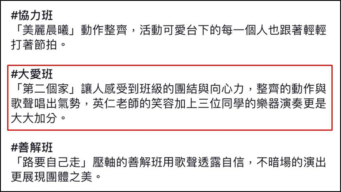 比賽結果,分成「最佳演出獎」及「優勝」,基本上就通通有獎了,各班領獎皆大歡喜,校長感念各班導師,辛苦陪伴學生彩排演練,亦頒獎國一各班導師。網路上也擷取了本班的評語。