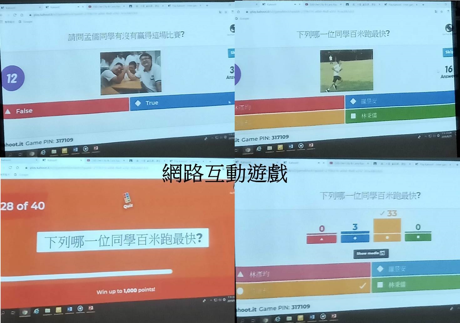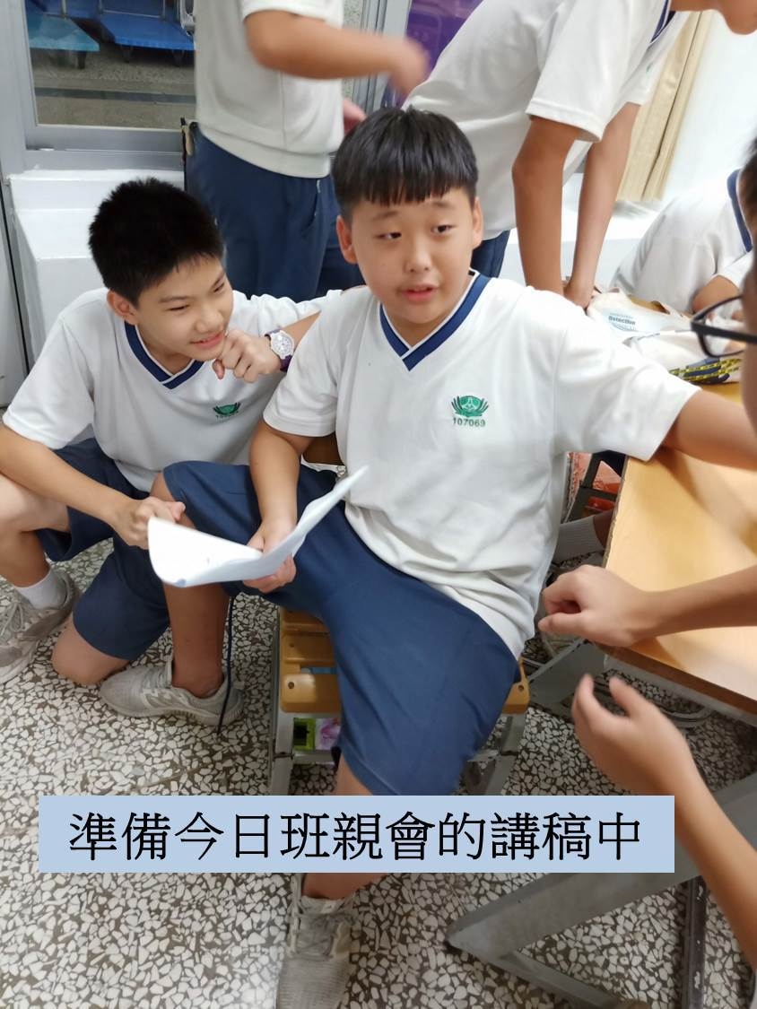 班親會家長陸續報到,孩子服裝整齊地為家長奉茶水、點心;下午2:00由英仁導師開始班務報告,也遴選家長委員,然後中間還玩一個遊戲,孩子們自己設計,透過網路家長也可以用手機加入;題目由40位同學出40題,內容大概是「班上誰跑得最快?」「誰的腿最長?」「誰最英俊?」等…。