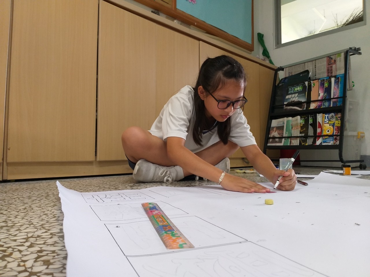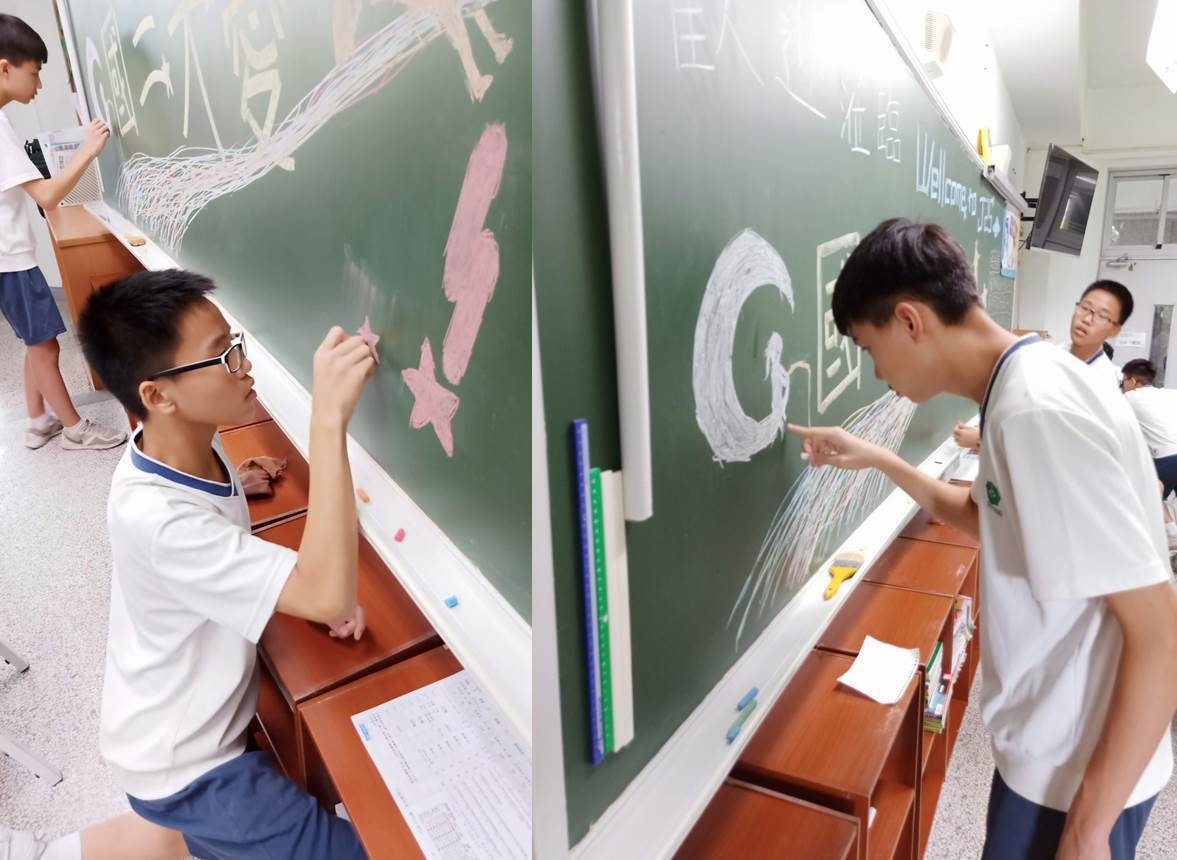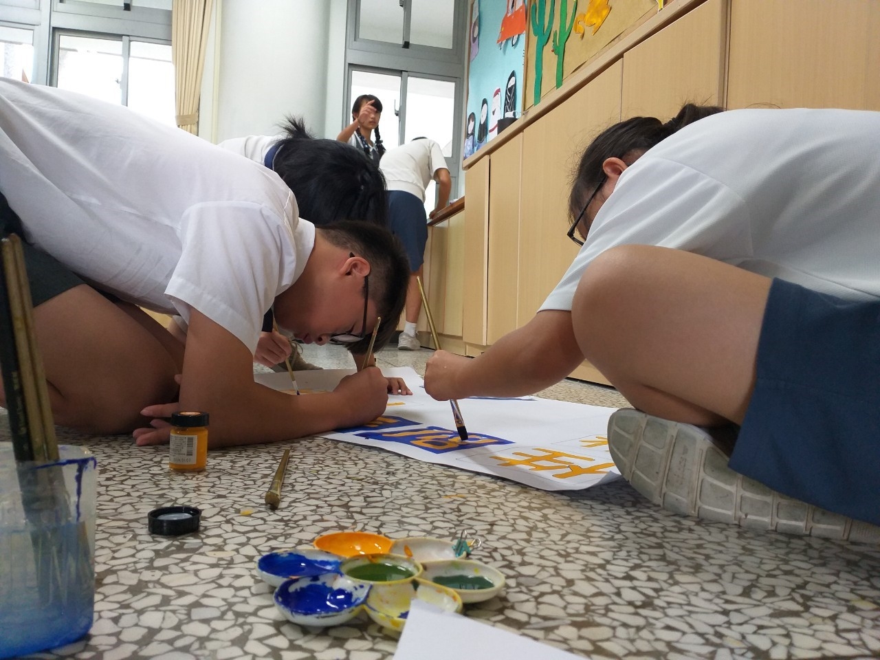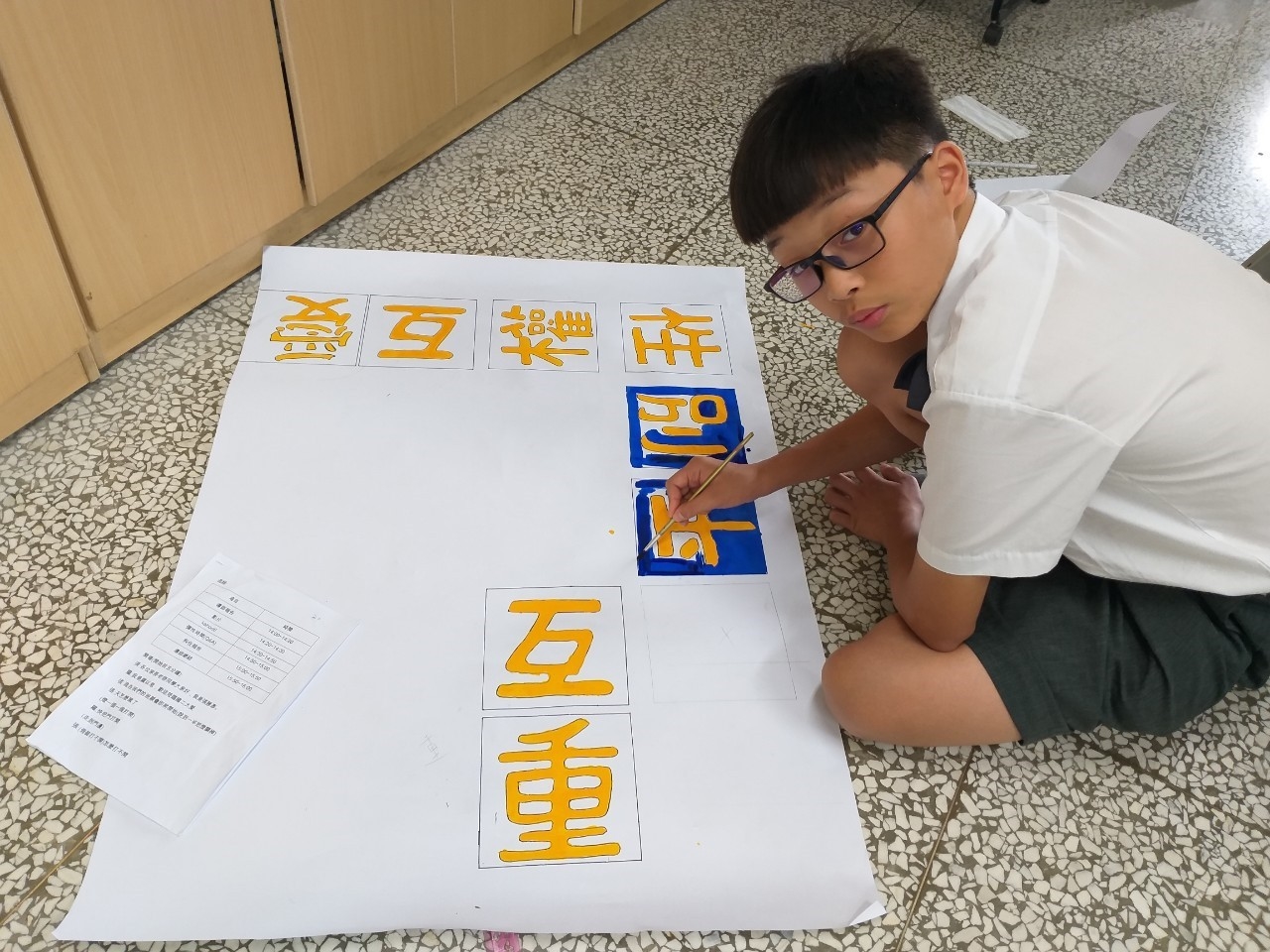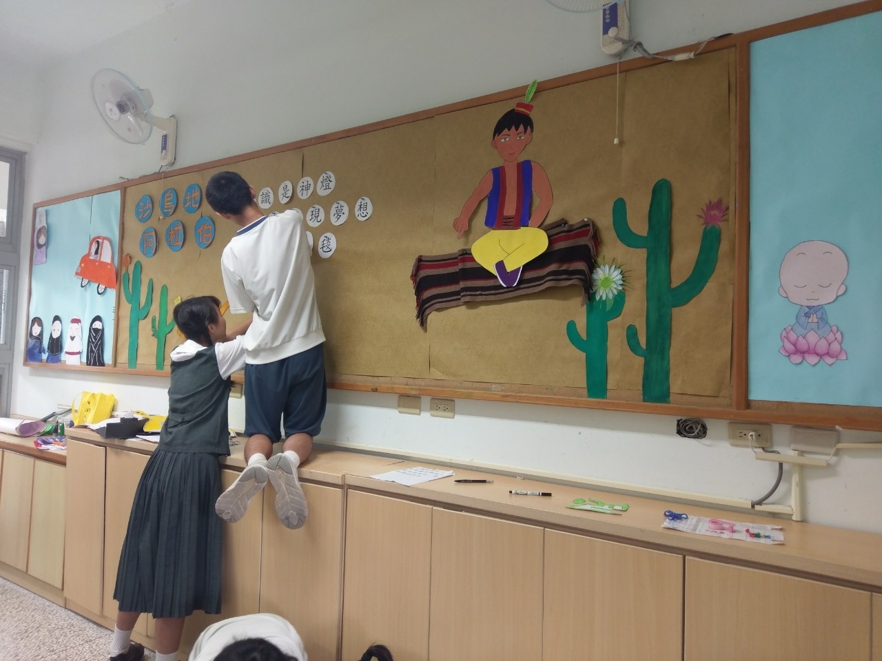 帶你遨遊世界」。早上還因為字太小,被老師要求重作,幾個孩子可是拚了命在做,趴在地上,彩繪的彩繪,剪紙的剪紙,還有爬上爬下的貼,大家分工合作,總算中午吃飯前完成。