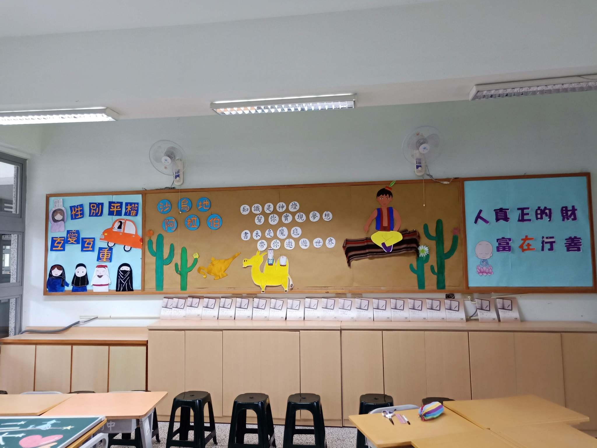 今日是學校親師座談會,早上在演藝廳是校務報告,可是在班級,學生、老師、懿德爸媽可沒閒著;前面黑板正畫著歡迎家長的海報,後面公佈欄正重新布置,國家是阿拉伯,還有兩性平等,公布欄上的幾句話很好;「知識是神燈,幫你實現夢想;書本是魔毯,