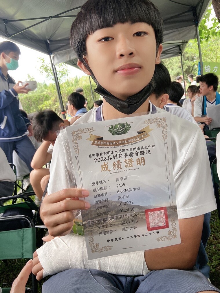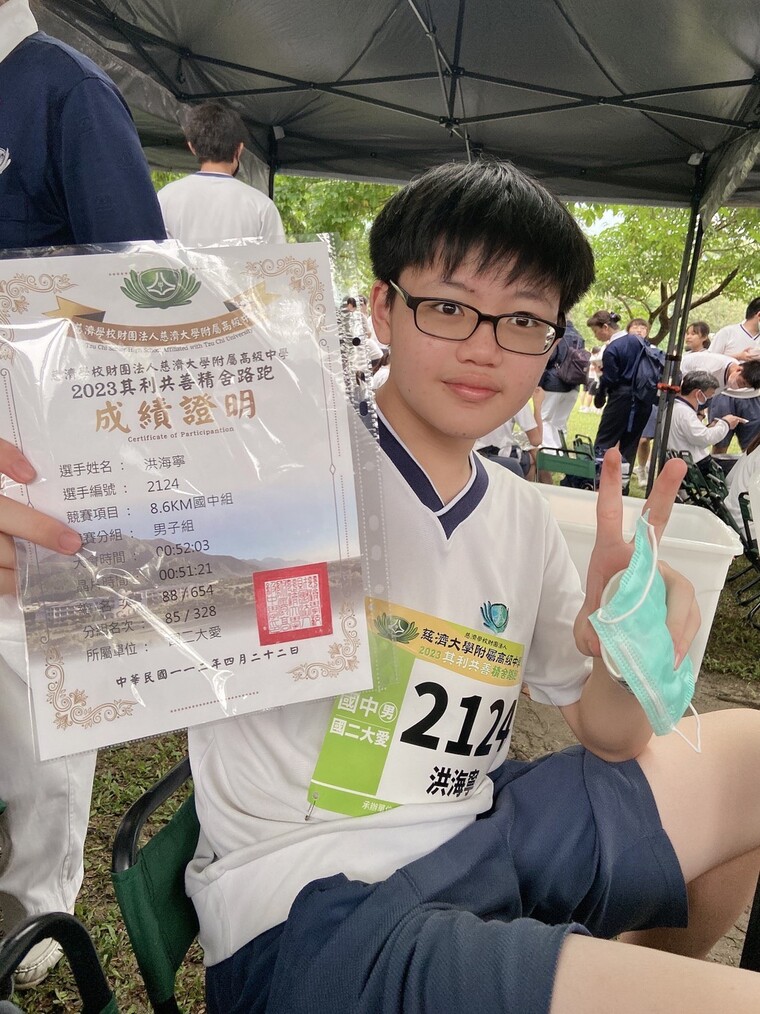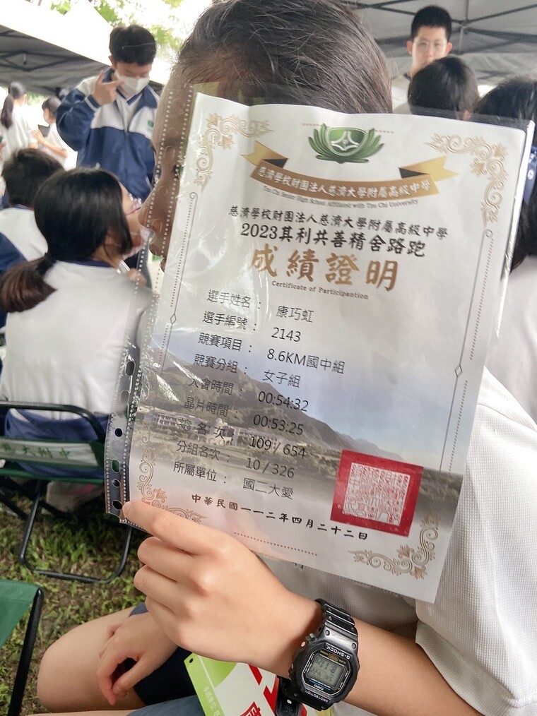 班上女生組跑得最快的是康巧虹,只花54:32就完成。男生組第一名是何聿博。左手上石膏的黃彥碩也以1小時25分跑完全程,真是不簡單。