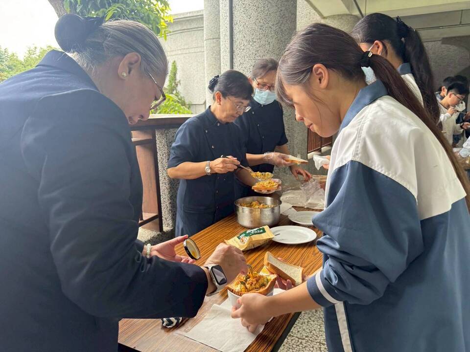 今天手作吐司沙拉,材料由爸爸媽媽分工在家處理,帶到學校再組合成一道色香味俱全的沙拉。