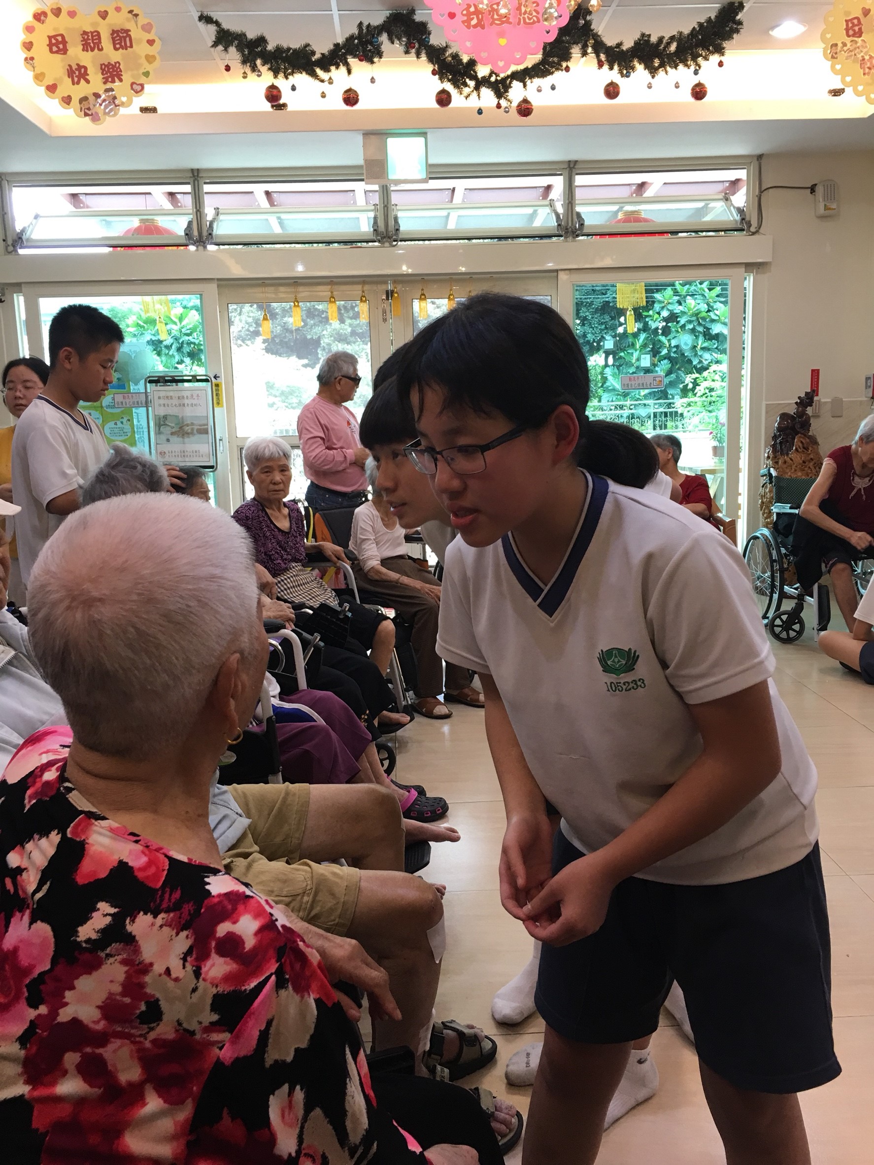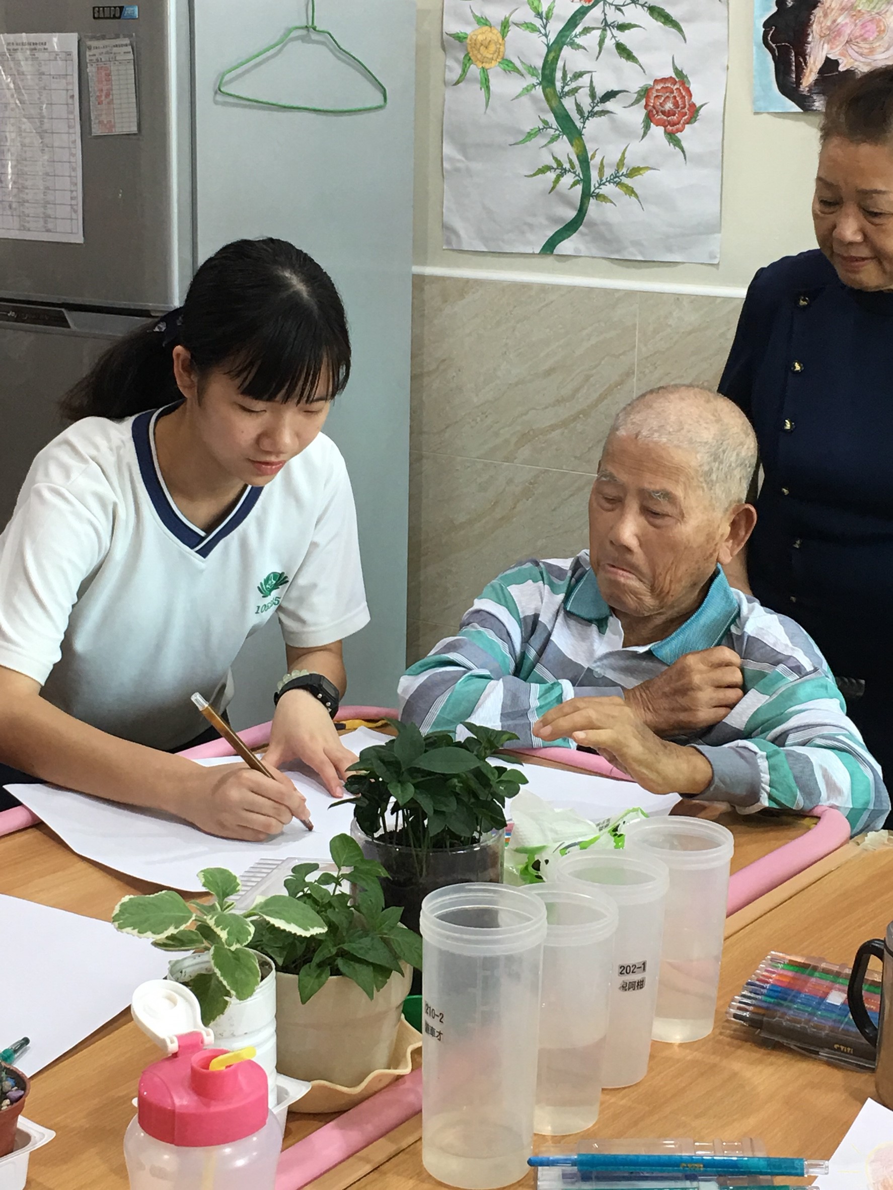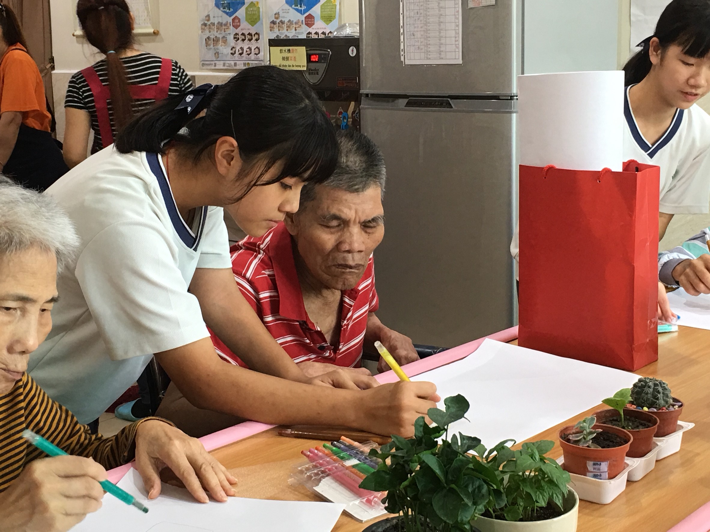 慈大附中學生:「她說她想要畫什麼,她說她想要畫大家,這些都是她自己畫的。(把她當成什麼)自己的阿公阿嬤。」 慈大附中學生 黃名村:「幫他按摩,然後抱他。」和長者們的互動,沒有孩子想像的困難。