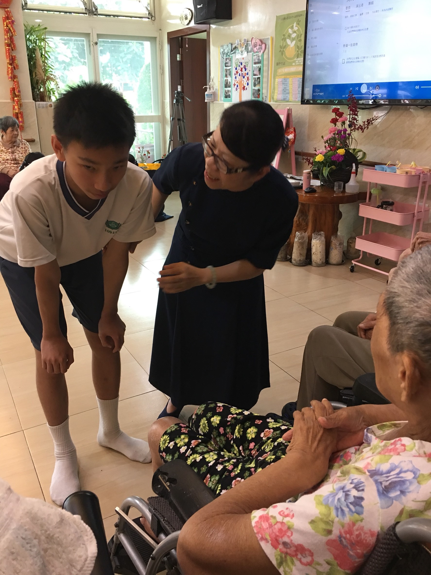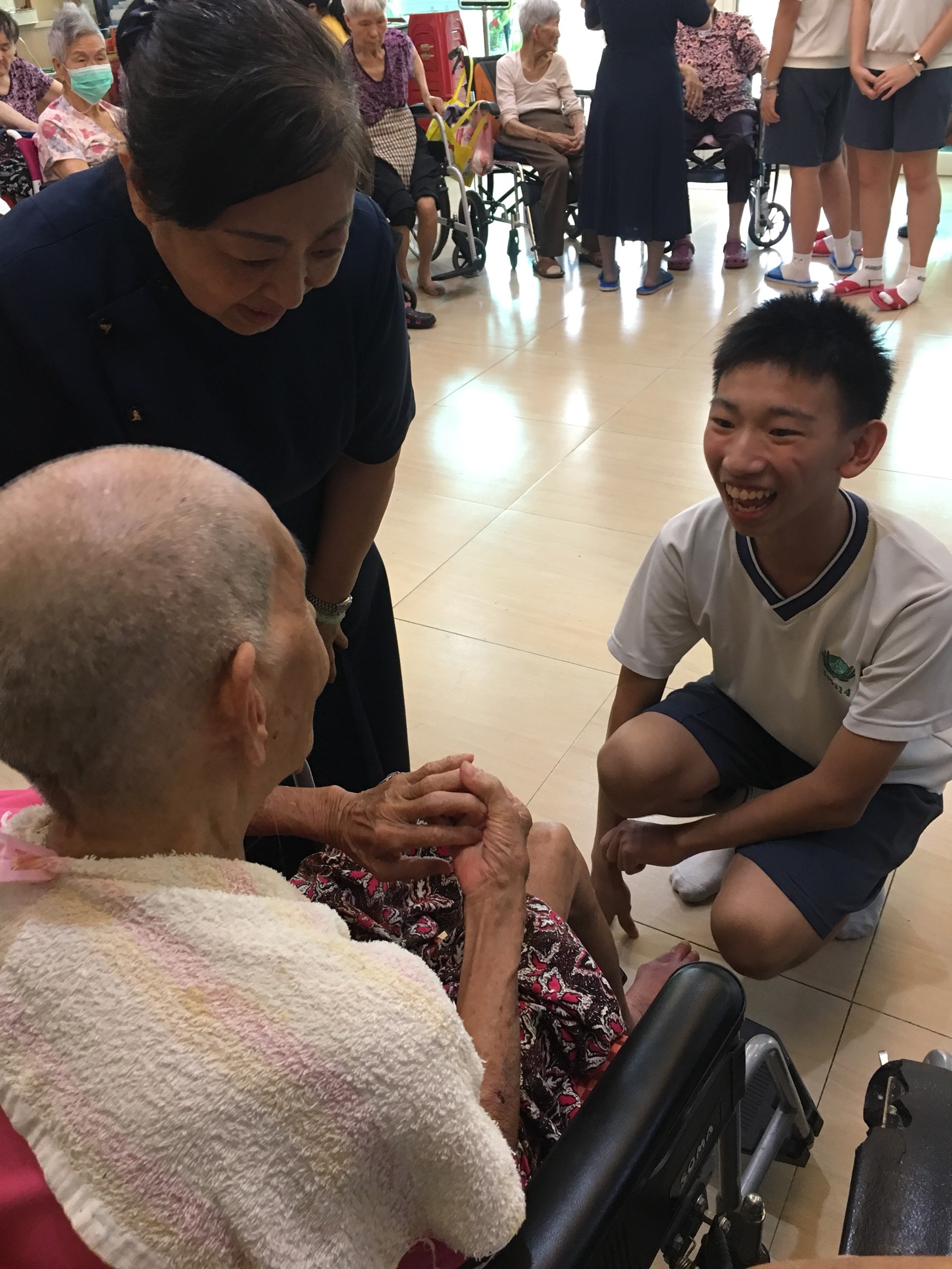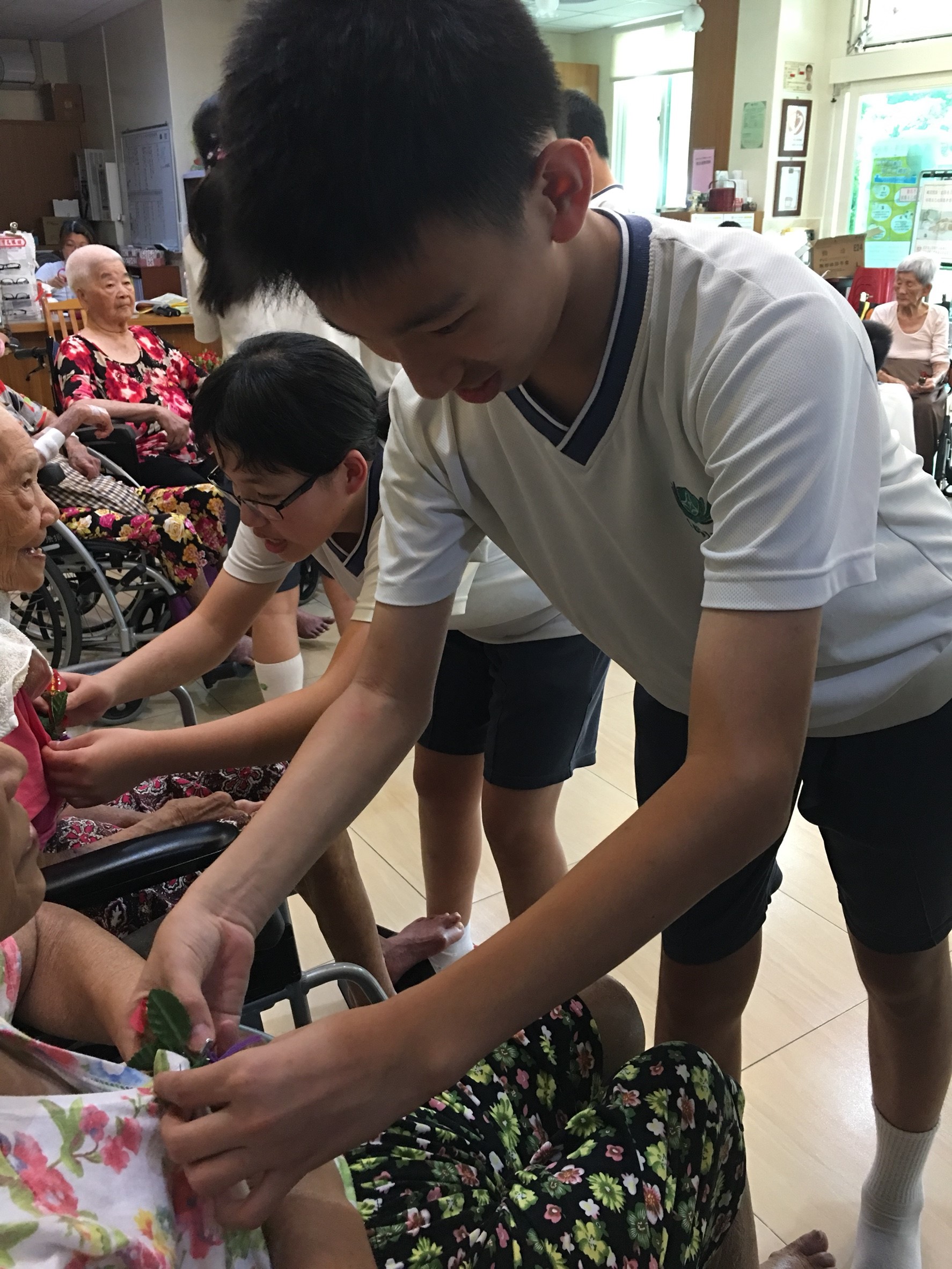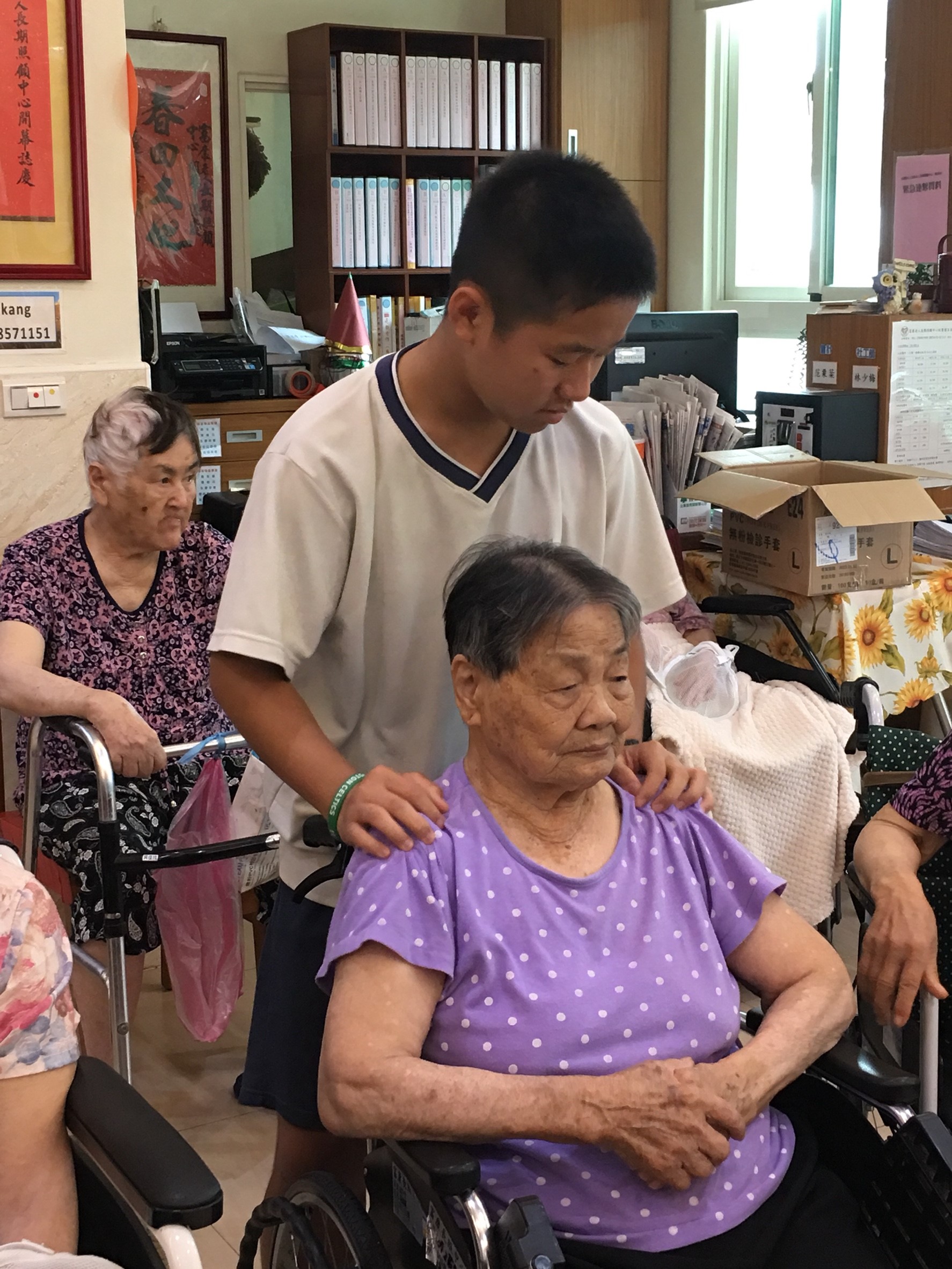 慈大附中學生:「她說她想要畫什麼,她說她想要畫大家,這些都是她自己畫的。(把她當成什麼)自己的阿公阿嬤。」 慈大附中學生 黃名村:「幫他按摩,然後抱他。」和長者們的互動,沒有孩子想像的困難。
