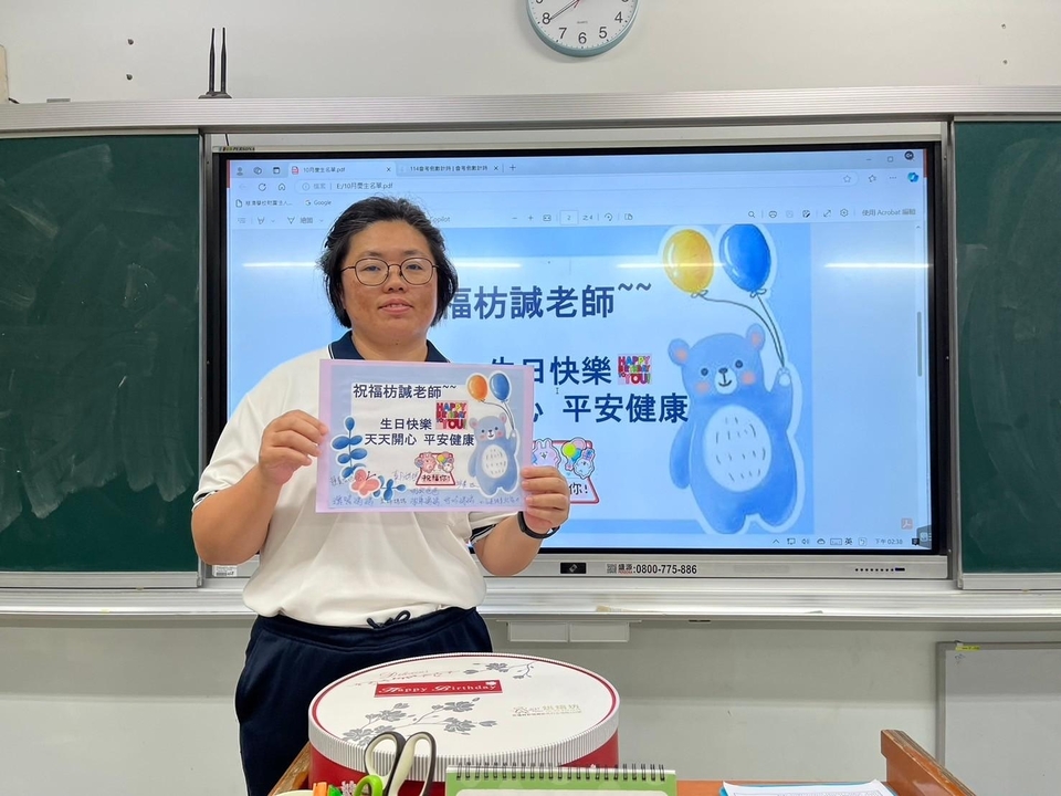 以食輪轉法輪,孩子們期待的點心時間,因著要幫導師枋諴老師慶生,氣氛更是歡樂~李蔚同學在電腦鍵盤上敲敲打打,生日快樂歌曲籠罩了整間教室。生日蛋糕是淑華媽媽為了特別訂製,以糯米紙列印(無色、無味、無毒),將全班大合照照片放在蛋糕上~當老師打開生日蛋糕,伴隨大家歡呼聲,臉上立刻揚起感動與喜悅的表情。在充滿幸福洋溢與感動的教室裡,孩子們真善美的心,燦爛的笑容,是每個月懿德日最美的畫面。