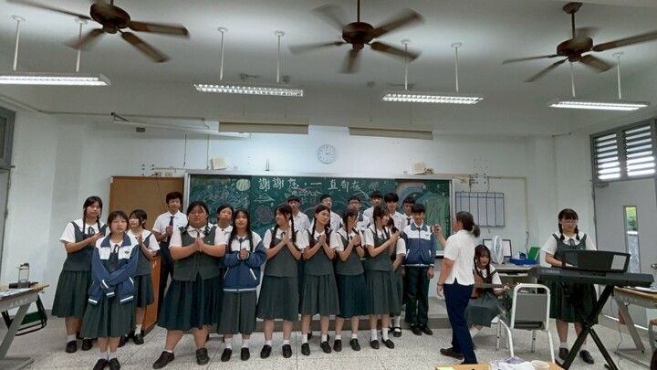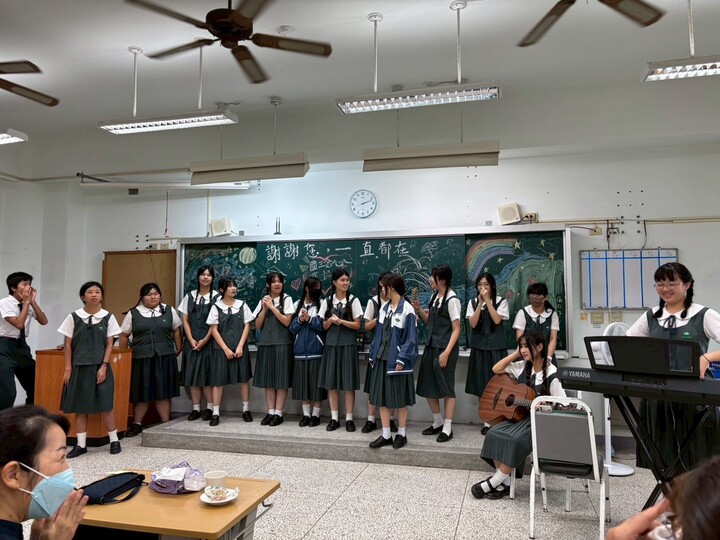 孩子們也陸續上台感恩媽媽們這三年的陪伴,表演節目由姵岑彈電子琴和珞妘彈吉他,同學們一同獻唱,接著再由男同學一同上台演出,媽媽們當起觀眾,也細細回味孩子這三年的成長,感觸良多。