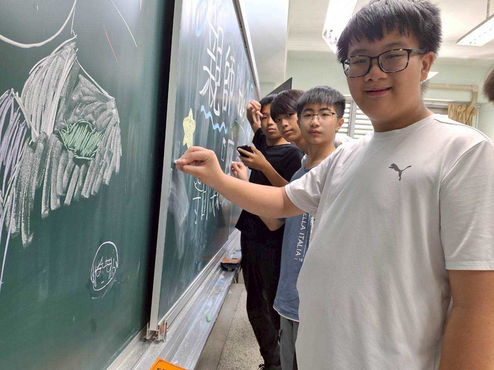 親師座談,黑板上的圖案及親師座談的字,也是一群孩子,各自發揮良能共同組成,還互相共識這樣比較好,孩子合和互協共同完成。