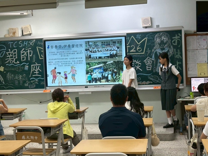 今天是新任逸貞校長第一次與慈懿會爸媽相見歡,校長分享其實她來慈中已經很多年了,從慈青一直到慈中當主任,到現在的校長,只是校長是第一次。