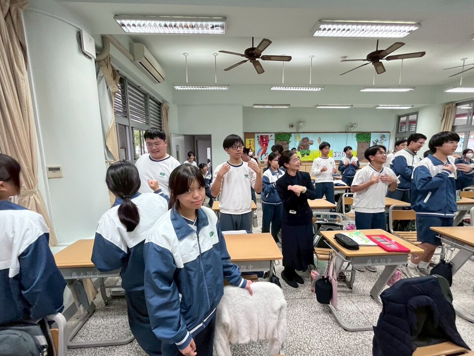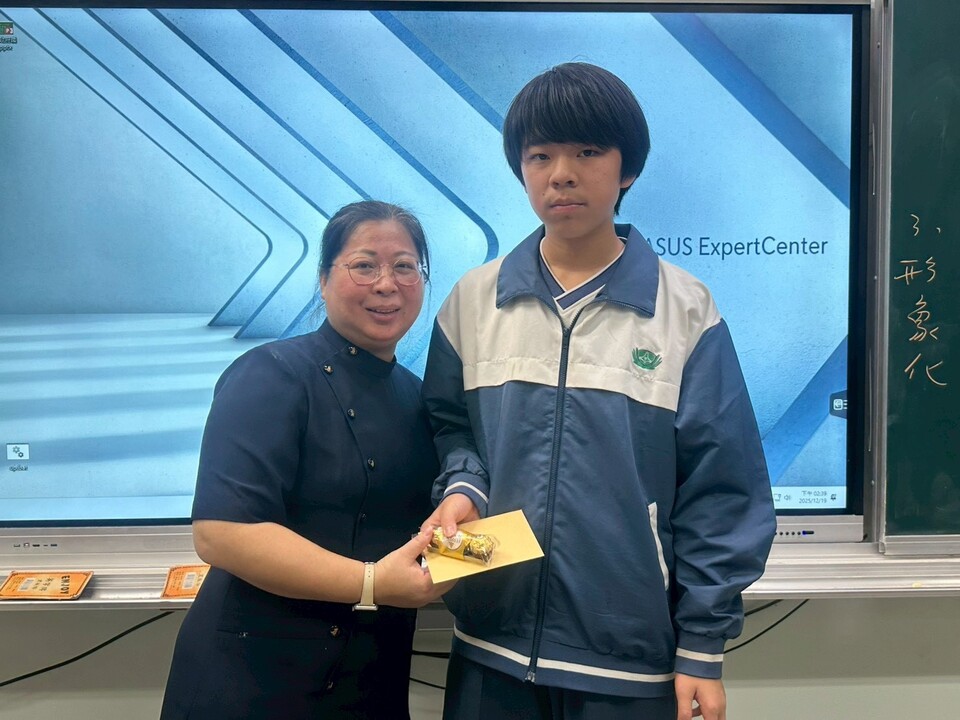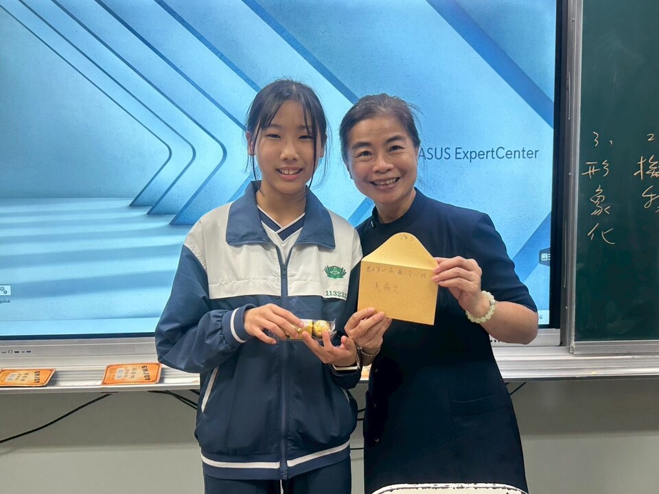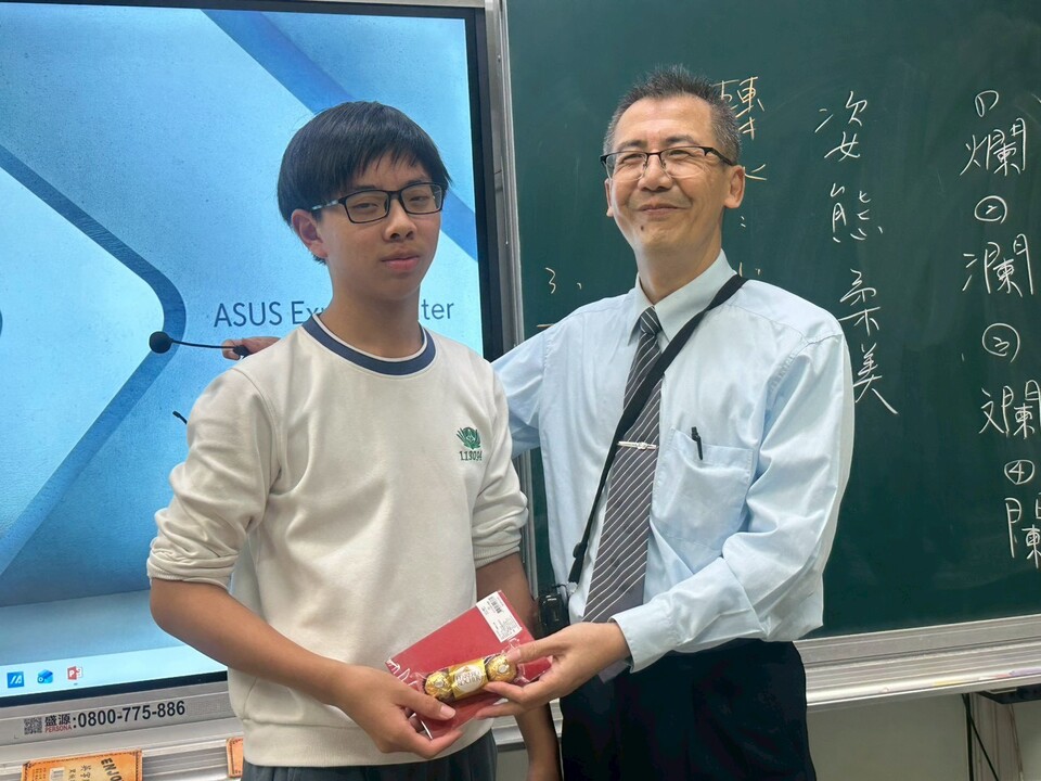 逸貞校長講述感飢12、送愛國際的活動成果、以及同學們榮獲花蓮縣及全國各項比賽好成績,其中班上同學葉煥胤花蓮縣羽球國中男子組雙打第三名,潘品樂嗩吶國中B組全國第一名。