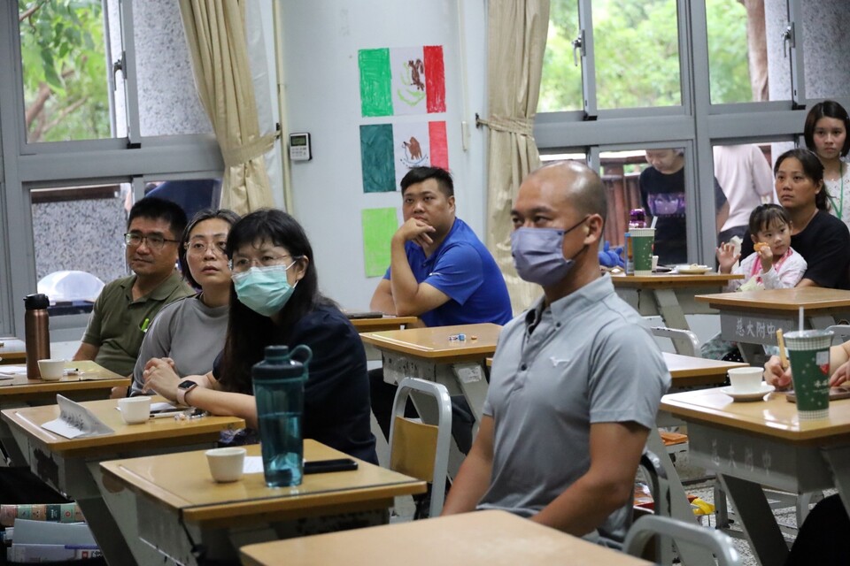 家長專注聽導師說、孩子們勇敢分享報告。