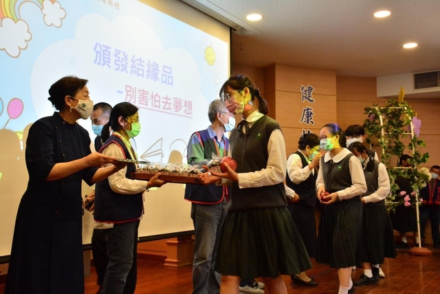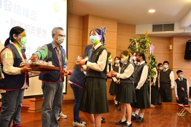 3、下午到人文館家長會舉辦一個激勵有溫馨的志學營圓緣,用心親自為孩子做巧克力馬芬,加上打了一個結的青森大蘋果,象徵好結果加考滿分,為國三的孩子們加油鼓勵。懿德會若岑媽媽送給大家一個環保資料夾和一本勵志小書—用兩隻腳走路的青蛙。讓孩子們從志學門走入勤學門,勇敢地踏上人生的第一個關卡。