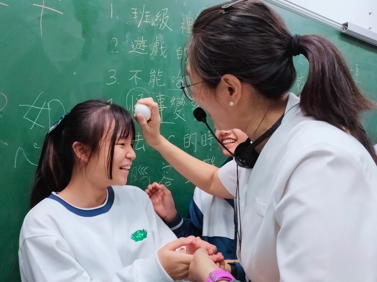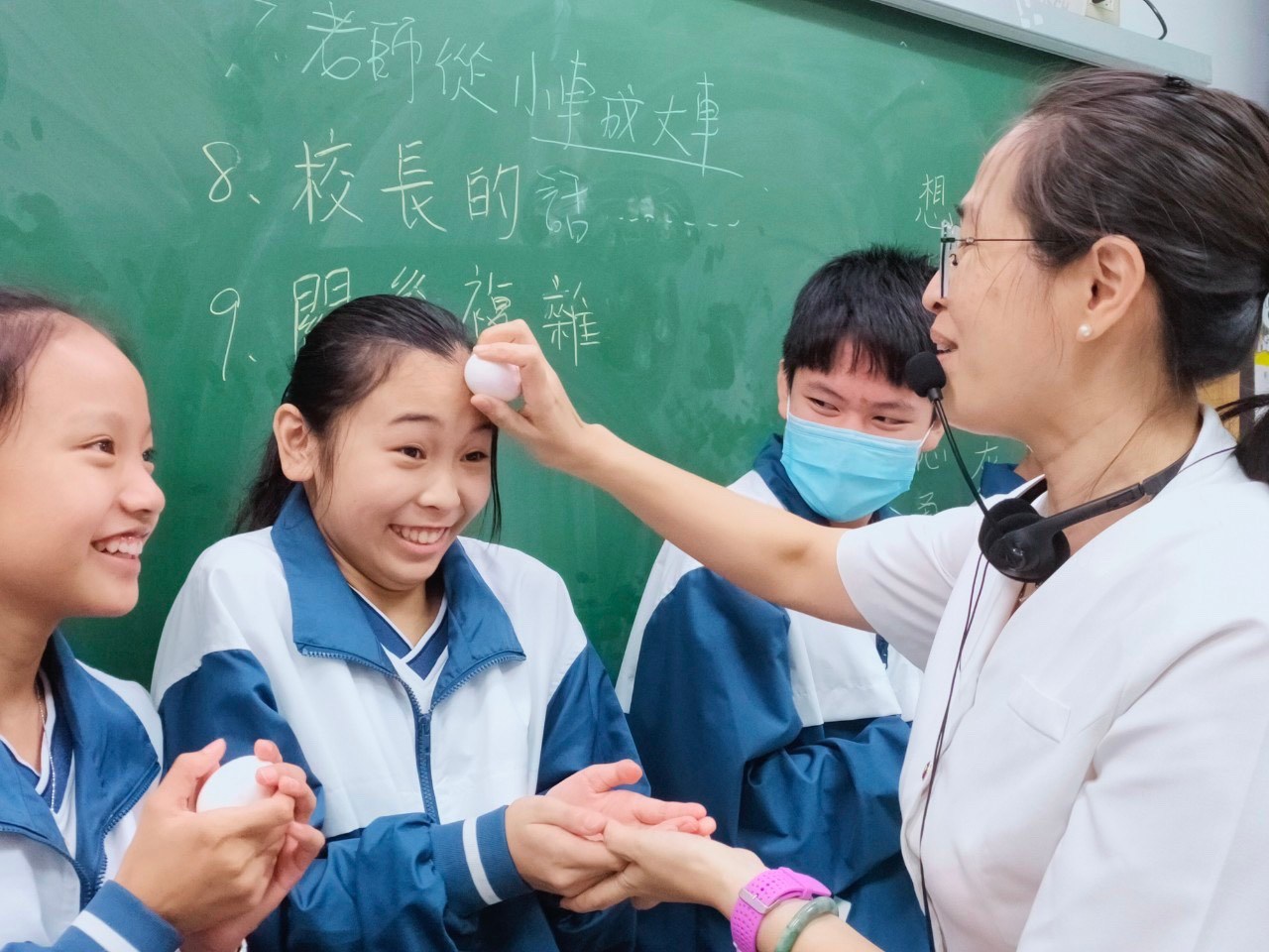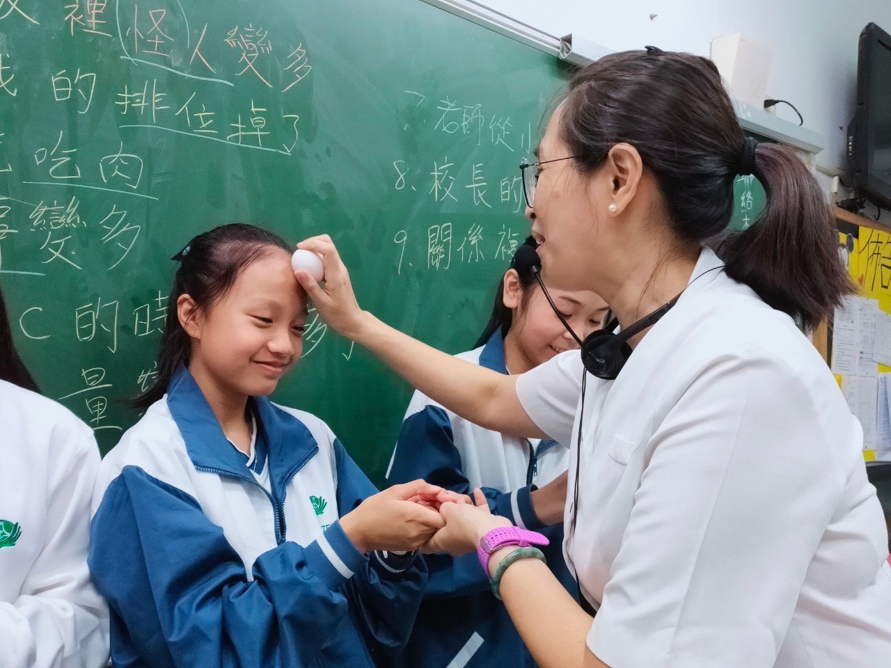 接著是孩子們最期待的時刻~孩子們輪流一一上台「用熟雞蛋」敲老師的頭為老師說一句祝福的話;其中有一兩個孩子特別調皮,把老師的頭給敲紅了;老師不但沒有生氣,還面帶笑容説:孩子難免會調皮搗蛋,善解的心真是令人敬佩。